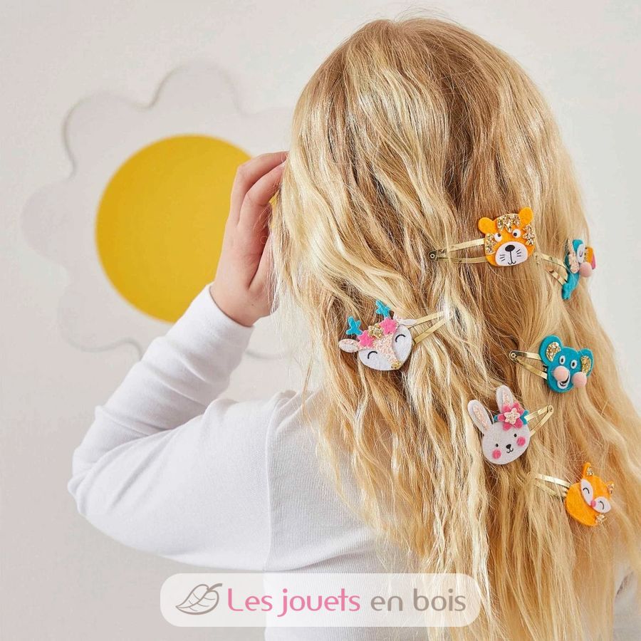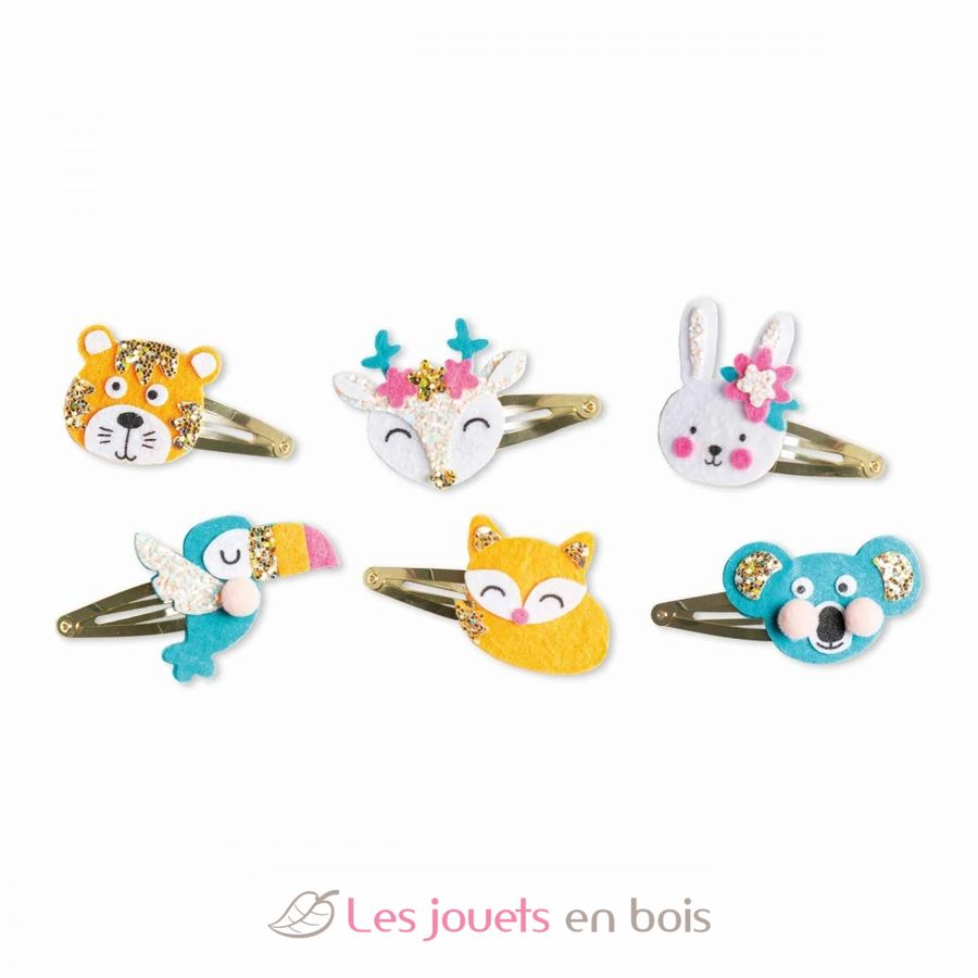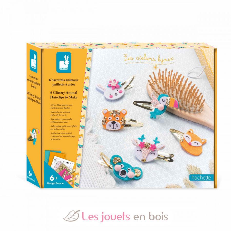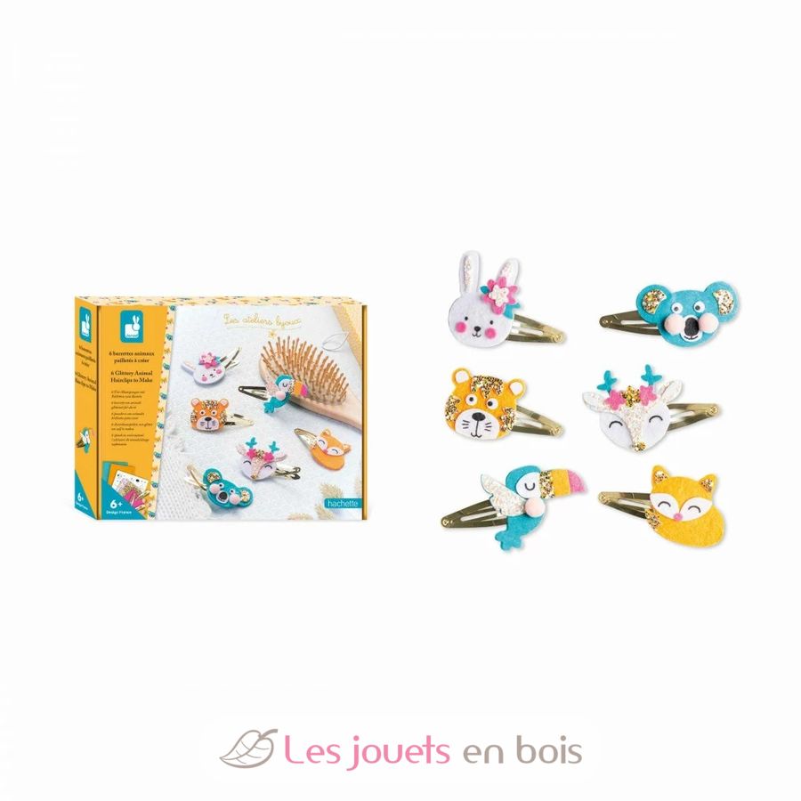 Découvrez le kit créatif 6 barrettes animaux pailletés à créer de la collection Les ateliers bijoux de chez Janod, une activité de création de barrettes à cheveux pour les enfants à partir de 6 ans.