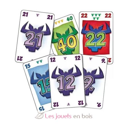 Ces drôles de cartes valent de 1 à 7 têtes de boeufs chacune. Votre but : en récolter le moins possible. En début de manche vous recevez 10 cartes. A chaque tour, les joueurs choisissent une carte et la révèlent à tous en même temps : ces cartes sont ajoutées à l’une des 4 séries qui se forment sur la table. Celui qui doit jouer la sixième carte d’une série «récolte» les 5 premières... et toutes leurs têtes de boeufs ! Quand les 10 cartes sont jouées, chacun compte ses boeufs et les additionne à son total précédent. Après plusieurs manches, le plus petit troupeau gagnera la partie.