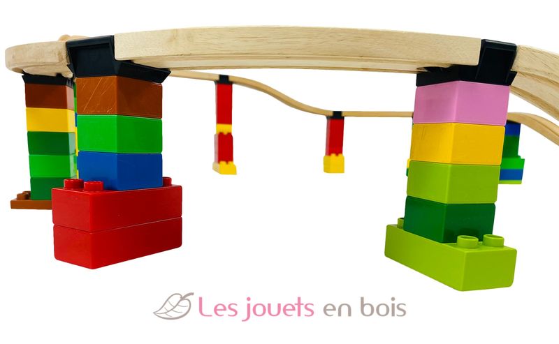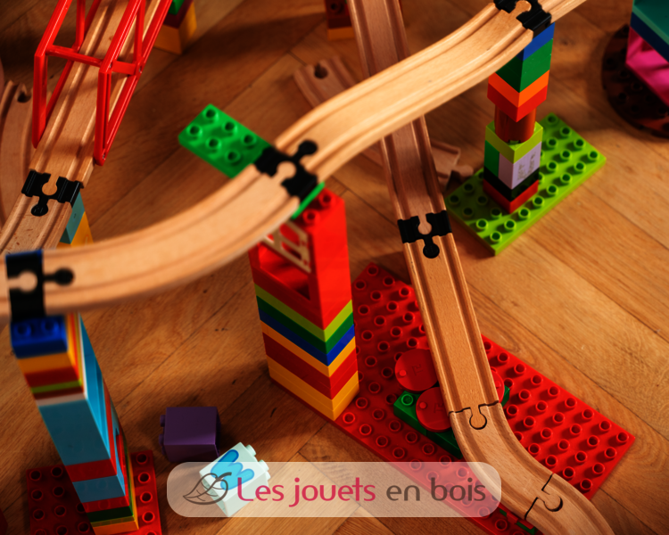 Avec les connecteurs Toy2, vous pouvez combiner vos briques Duplo®, Hubelino®, Biobuddi® ou autres blocs similaires, avec vos circuits de train et rails en bois Brio®, Ikea®, Bigjigs®, Vilac®, Janod®, Hape® et autres… ce qui offre de nouvelles possibilités de construction et de jeu !