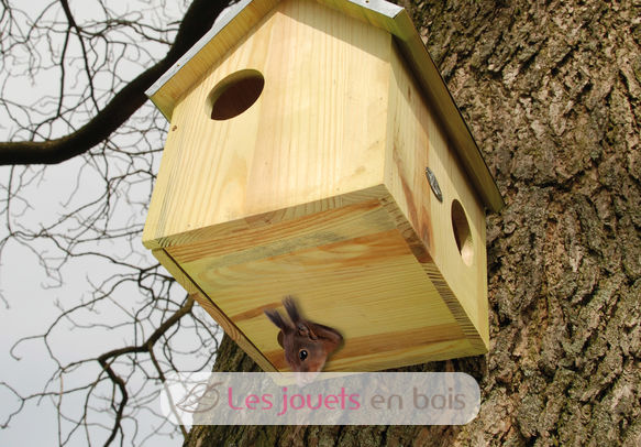 Cette maison pour écureuil dispose de plusieurs entrées assez larges pour que les écureuils puissent s'y introduire facilement, seuls ou avec leurs bébés. Elle sera un refuge parfait pour ces rongeurs durant l'hiver. Il est important que la maison pour écureuil soit placée à environ 3 ou 4 mètres au-dessus du sol et à côté d'une branche pour que l'écureuil puisse s'échapper facilement en cas de danger. Une façon ludique de faire décourvir les animaux de votre jardin à vos enfants !