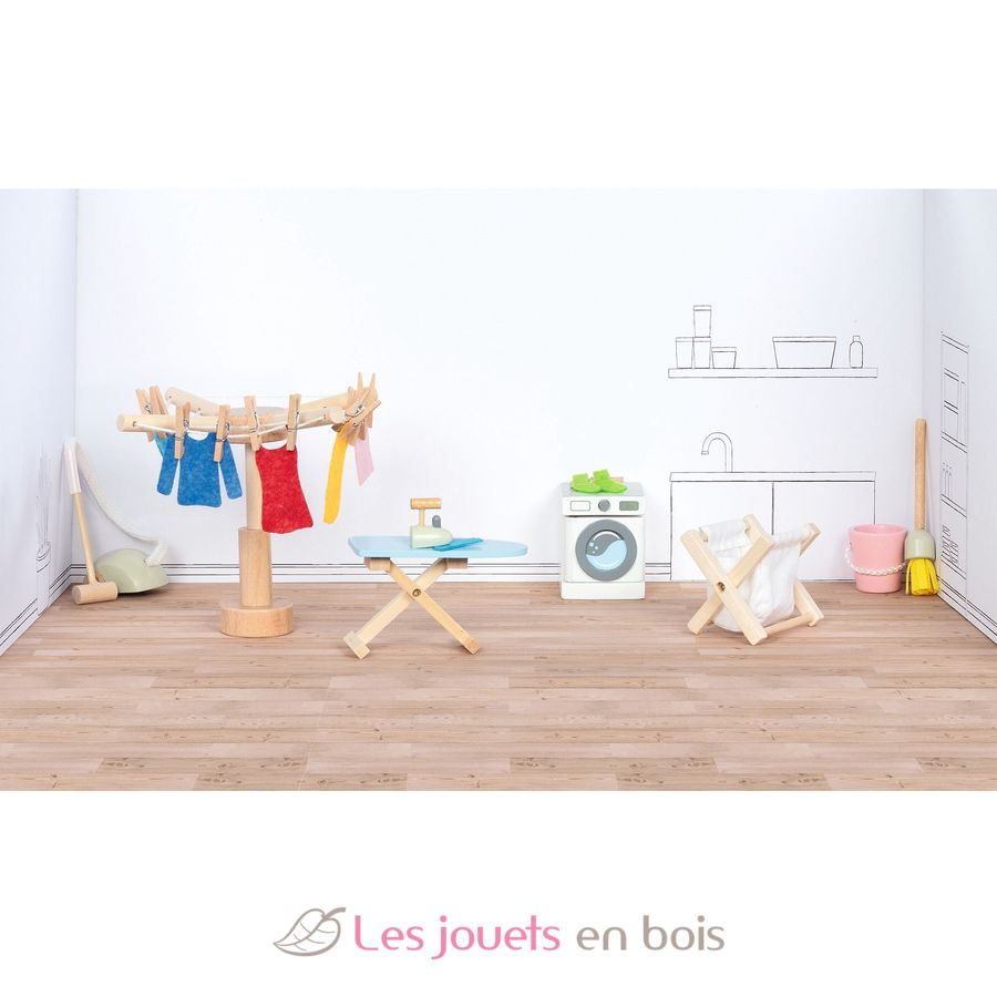Ce set d'accessoires en bois pour la buanderie s'intègre parfaitement dans une maison de poupées.