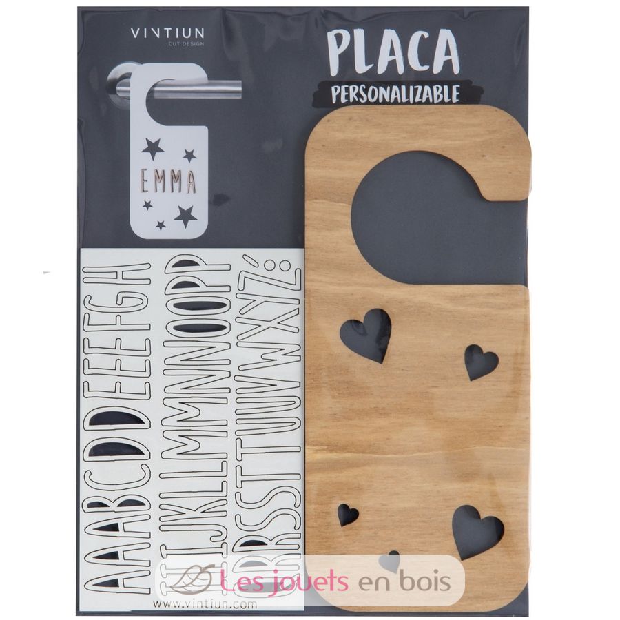 Le kit comprend : 1 accroche-porte en bois ; 1 planche de lettres en bois autocollantes. Dimensions : 8,5 x 19 cm.