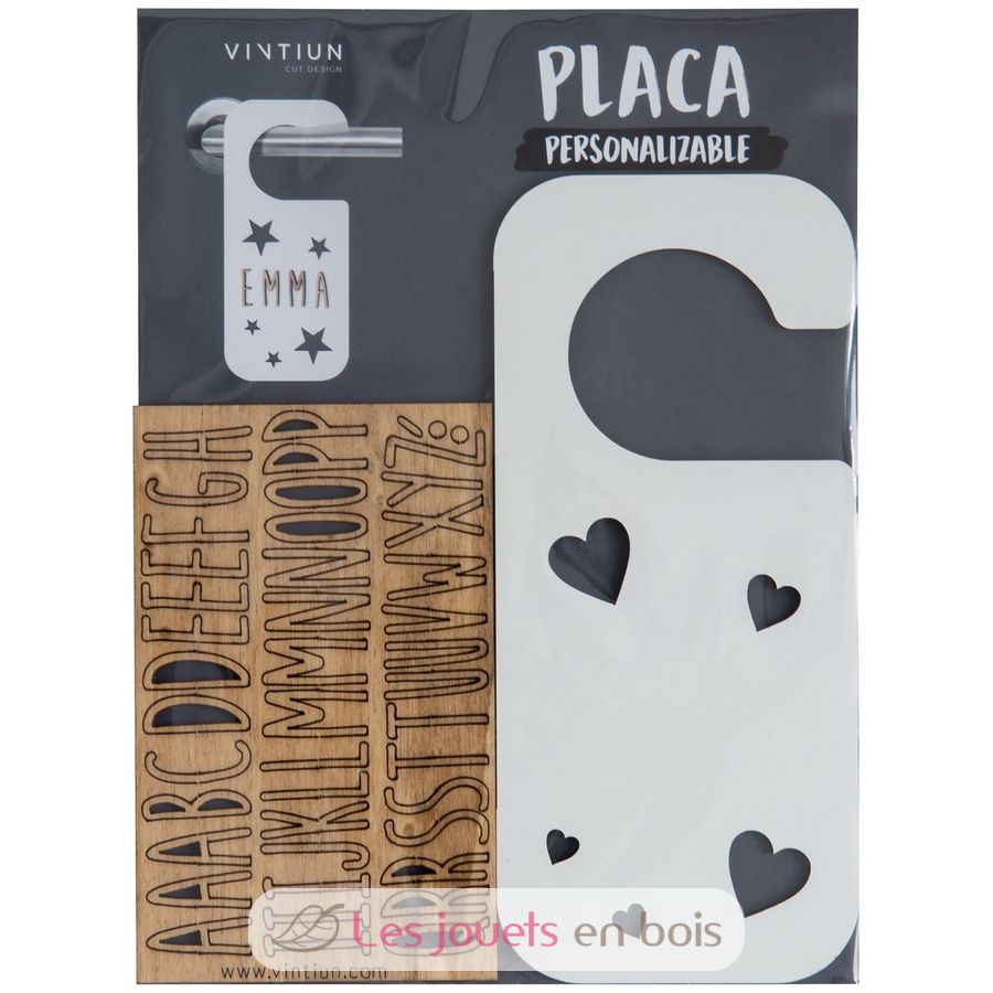 Le kit comprend : 1 accroche-porte en bois ; 1 planche de lettres en bois autocollantes. Dimensions : 8,5 x 19 cm.