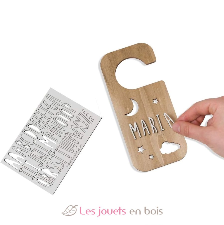 Le kit comprend : 1 accroche-porte en bois ; 1 planche de lettres en bois autocollantes. Dimensions : 8,5 x 19 cm.