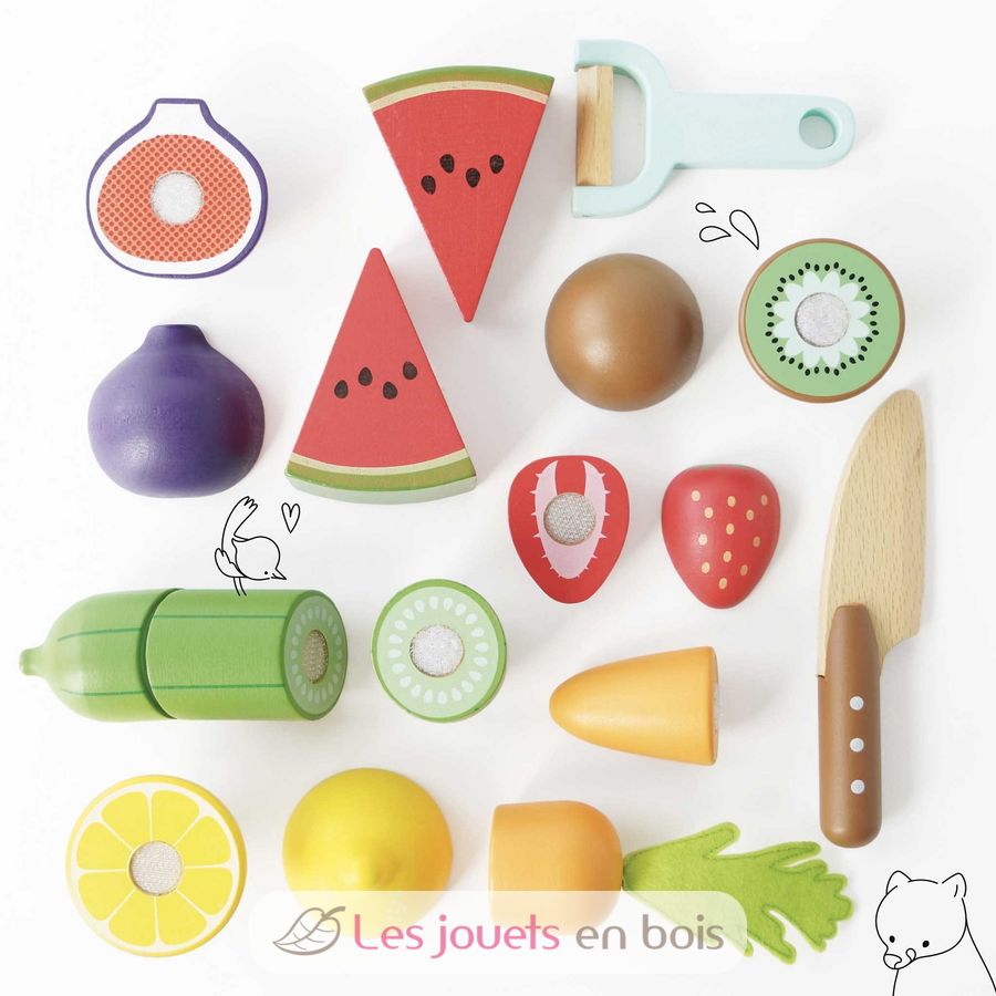 Cet ensemble de 18 pièces comprend une planche à découper (22,5 x 16 cm), un faux couteau, un éplucheur ainsi qu'une sélection de fruits et légumes savoureux qui peuvent être découpés puis reconstitués grâce aux velcro astucieux.