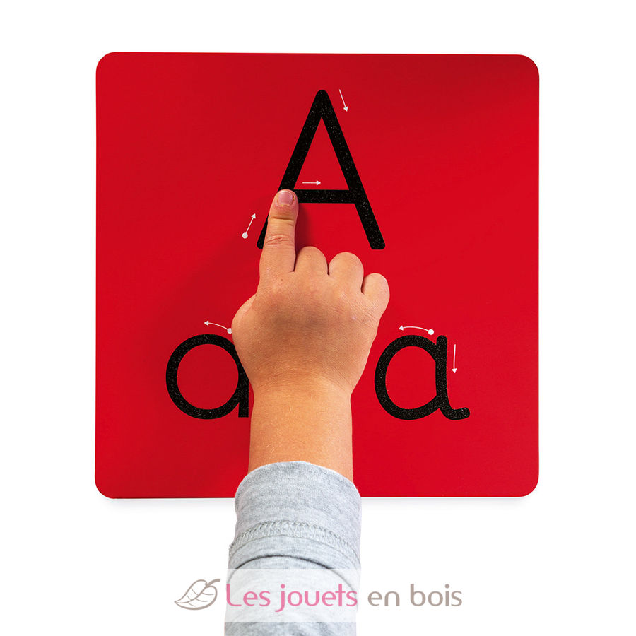 Ce jeu éducatif est idéal pour découvrir les lettres de l'alphabet et apprendre à les écrire. Chaque fiche correspond à une lettre avec au recto la lettre en relief sous 3 formes (en capitale majuscule, en capitale minuscule et en lettre cursive minuscule), avec le sens d'écriture pour former la lettre correctement. Le relief permet aux enfants de passer les doigts sur les lettres et de s'imprégner des formes et des sens d'écriture. Au verso, l'enfant découvrira un côté effaçable pour s'entraîner à écrire la lettre en suivant le modèle.