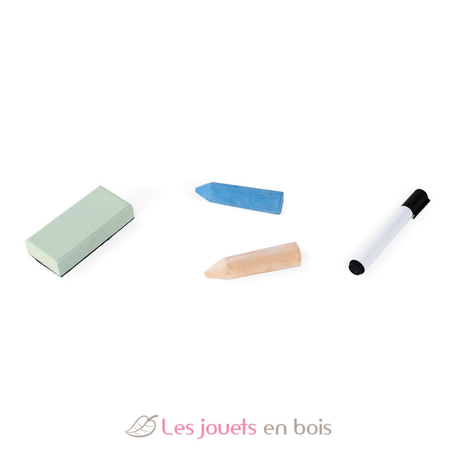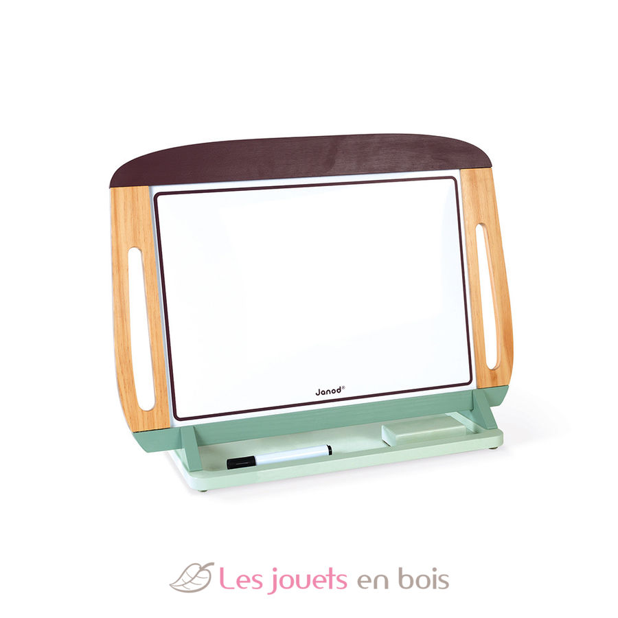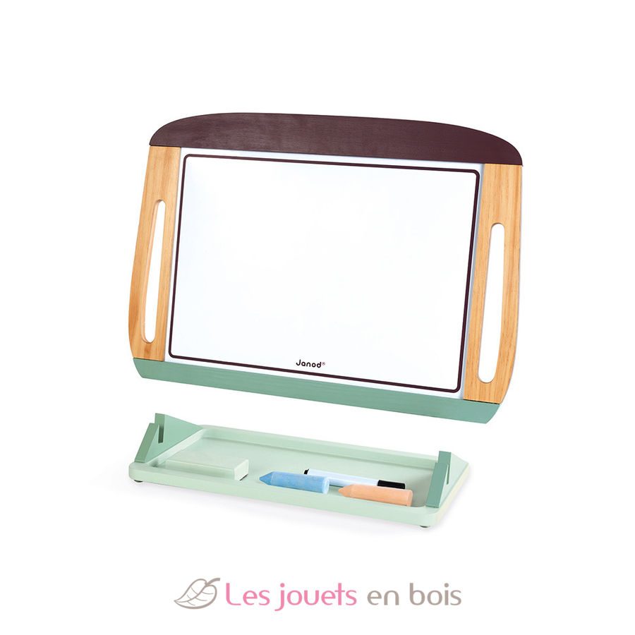 D'un côté, on retrouve la face ardoise noire sur laquelle les enfants pourront dessiner grâce aux 2 grosses craies fournies. De l'autre, on pourra par exemple s'exercer à l'écriture avec le feutre effaçable sur la face blanche magnétique. Pratique pour jouer avec des lettres aimantées ! La petite brosse permet de nettoyer les œuvres des enfants pour pouvoir recommencer à l'infini ! De chaque côté du tableau, on retrouve des poignées permettant de faciliter le transport. Le socle vert anti-dérapant permet de poser l'ardoise sur une table afin d'en faire une utilisation plus verticale. Les artistes en herbe pourront laisser libre cours à leur imagination !