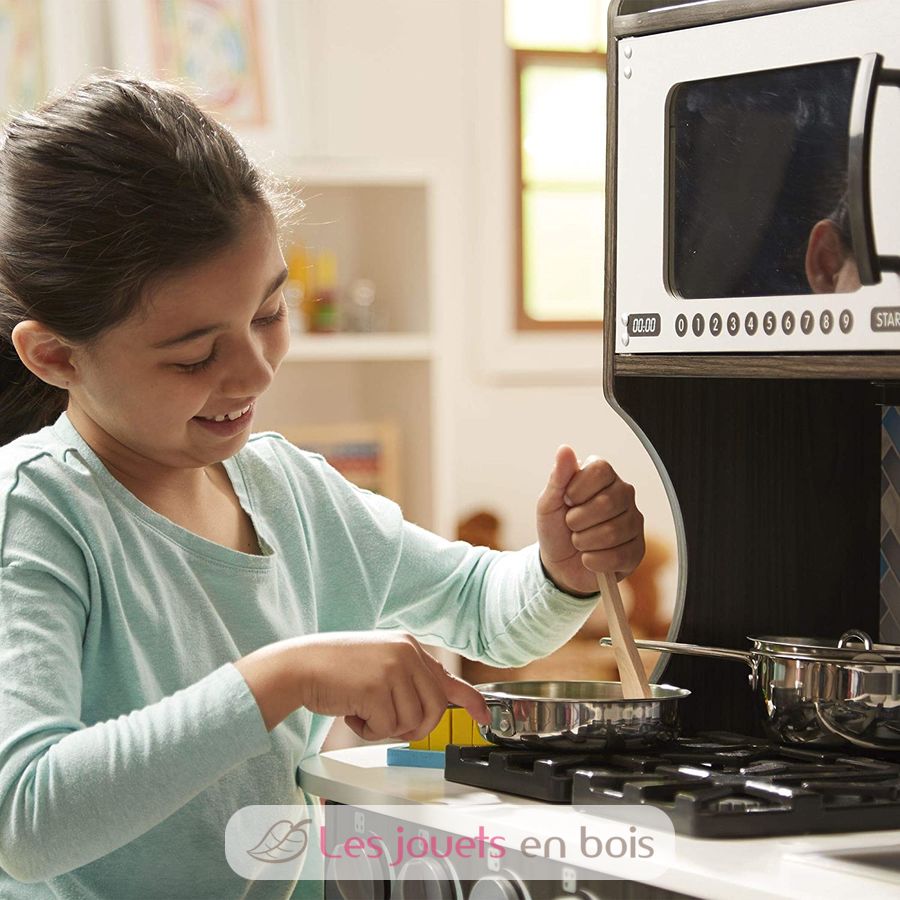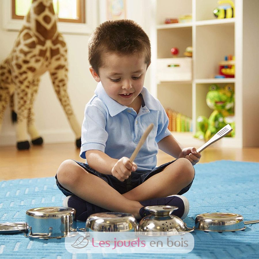 Cet ensemble d'ustensiles de cuisine pour enfant comprend : - une passoire, - une casserole avec couvercle, - deux poêlons, - deux ustensiles en bois, - une étagère Toutes les pièces de cette batterie de cuisine sont en acier inoxydable poli à la main pour une finition miroir magnifique. Les poignées sont robustes avec des joints rivetés. Se lave sans danger au lave-vaisselle. Cet assortiment de poêlons et casseroles, aux dimensions généreuses pour un look plus réaliste, promet une grosse dose de plaisir pour vos enfants ! Assortiment poêlons et casseroles de la marque Melissa & Doug référence 14265