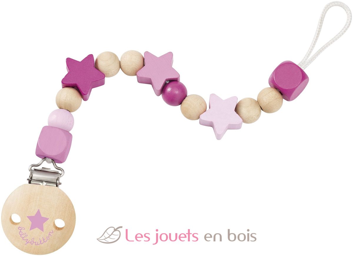 Des petites étoiles roses sont mélangées à des éléments ronds en bois. Le petit clip en bois avec un adorable lettrage Bellybutton permet d’attacher la tétine partout. Ainsi la tétine est toujours à portée de main de nos tout-petits. Un joli cadeau qui en réjouira plus d’un !