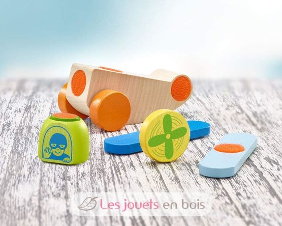Les pièces de ce jouet en bois sont maintenues par des bandes tissu auto-agrippant, ce qui permet de les détacher et les réassembler pour une construction créative.