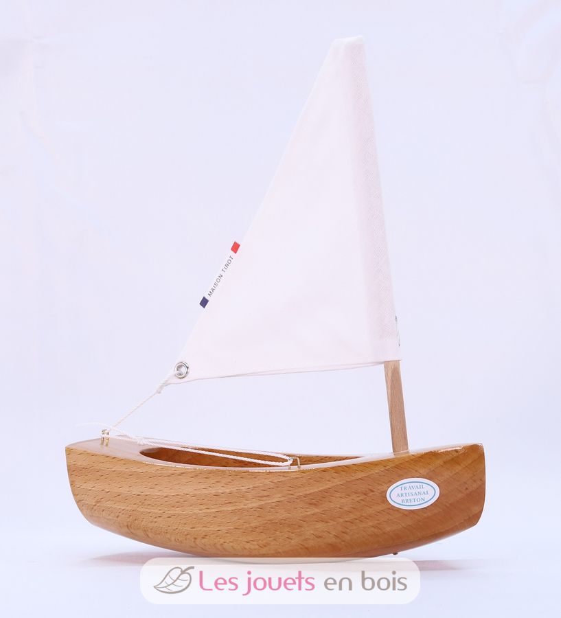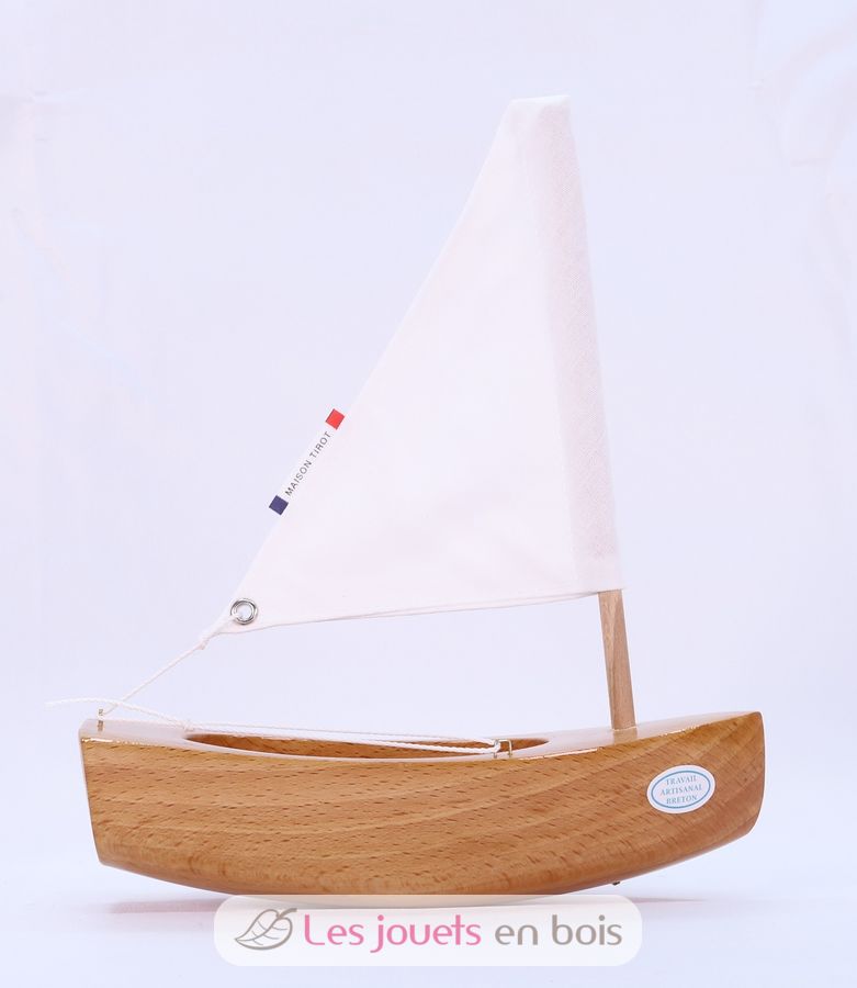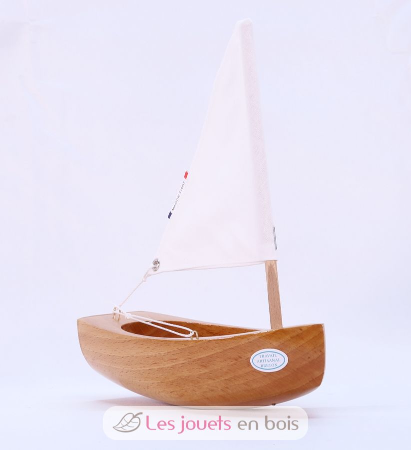 Fabriqué à la main, en bois de hêtre massif issu des forêts bretonnes, ce bateau est équipé d’une voile en coton de type bermudéen. Sa forme est inspirée des thoniers, bateaux de pêche d’autrefois avec lesquels nos anciens pêchaient… Un jouet de bain et de plage à destination des plus petits. N’étant pas équipé de quille ou de leste, son usage est plutôt réservé au bain ou à des petits bassins de plage. Un jouet coup de cœur pour les vacances à la mer !