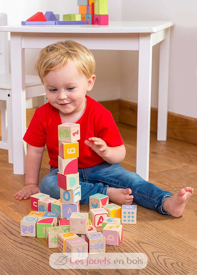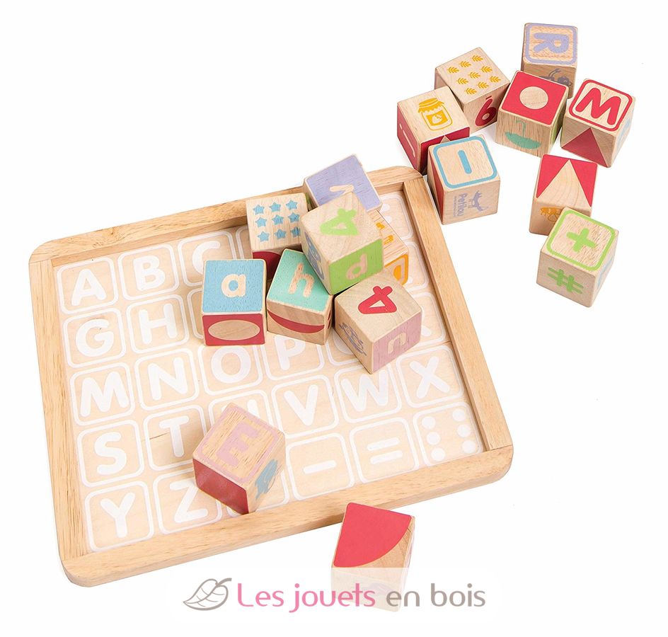 30 cubes en bois massifs sur un plateau en bois. Avec leurs 6 faces illustrées, ces 30 cubes en bois permettront à votre enfant d’apprendre tout en s’amusant. Idéal pour initier les plus jeunes à la reconnaissance des lettres (majuscules et minuscules) mais aussi des chiffres de 0 à 9. Les illustrations sont liées à la lettre ou au chiffre situé sur l’autre face du bloc afin d’aider à la reconnaissance des lettres et des chiffres. La sixième face du cube est illustrée de formes géométriques pour laisser libre cours à l’imagination des enfants.
