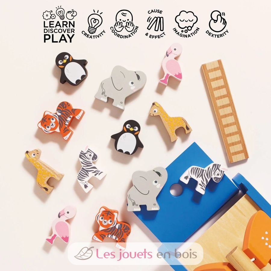 Ce jouet astucieux est doté d'une poignée de transport pratique, d'une échelle et d'une porte coulissante pour que les animaux montent et descendent. Il stimule l'imagination, la motricité fine et la reconnaissance des formes et des animaux chez les tout-petits.
