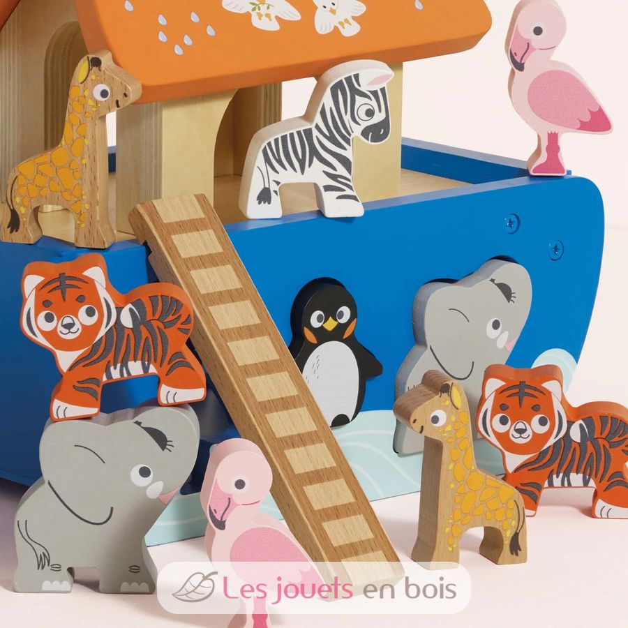 Cette arche peinte de couleurs vives est doublement amusante : à la fois boite à formes et ensemble de jeu avec figurines permettant aux enfants de s'inventer tout plein d'histoires.