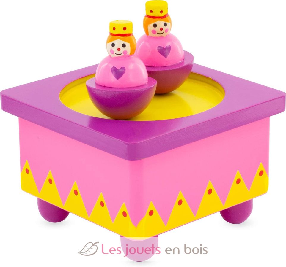 Jolie petite boite à musique en bois de 10cmx10cm. Lorsque l'enfant déclanche la musique, les princesses aimantées dansent et virevoltent. Un objet décoratif en bois de la société Ulysse. La mélodie de cette jolie boite à musique est : Someday my prince will come