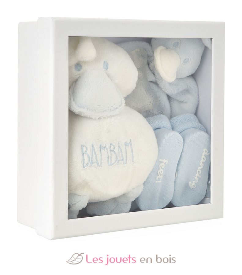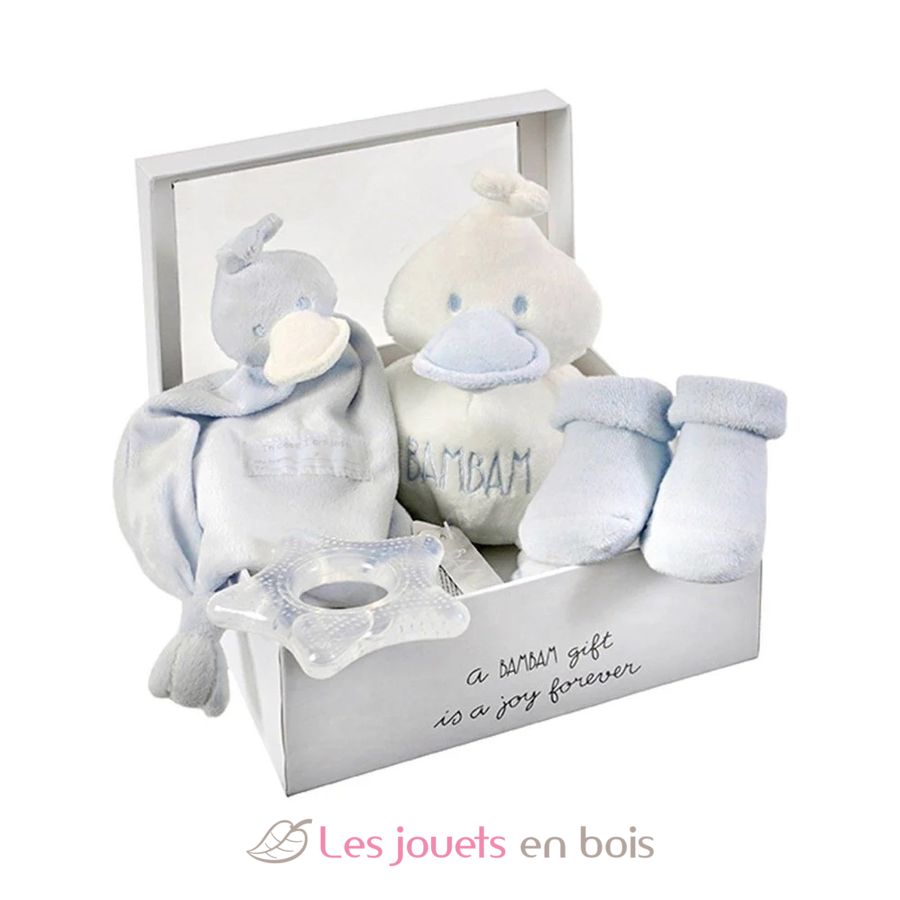 Cette boîte "canard bleu" BamBam est un très joli cadeau de naissance. Le coffret propose : - un doudou plat bleu, en forme de canard sur lequel on peut écrire le nom de l'enfant et le numéro de téléphone, très précieux en cas de perte ; - une peluche hochet "canard" blanc et bleu ; - une paire de chaussettes bleues avec l'inscription "dancing feet" ("danse des pieds") pour des enfants de la naissance à trois mois (85 % coton, 12,9 % polyester et 2,1 % 'élastane) ; - un anneau de dentition "couronne" (que l'on mettra au réfrigérateur quand Bébé fera ses dents). Cet ensemble est livré dans une jolie boîte blanche en carton avec une grande fenêtre sur le couvercle qui met en valeur les produits et permet de bien les voir. Doudou, peluche hochet et chaussettes sont lavables en machine. Boîte cadeau bleue, un coffret cadeau de naissance de la marque BamBam. Réf : BB50094