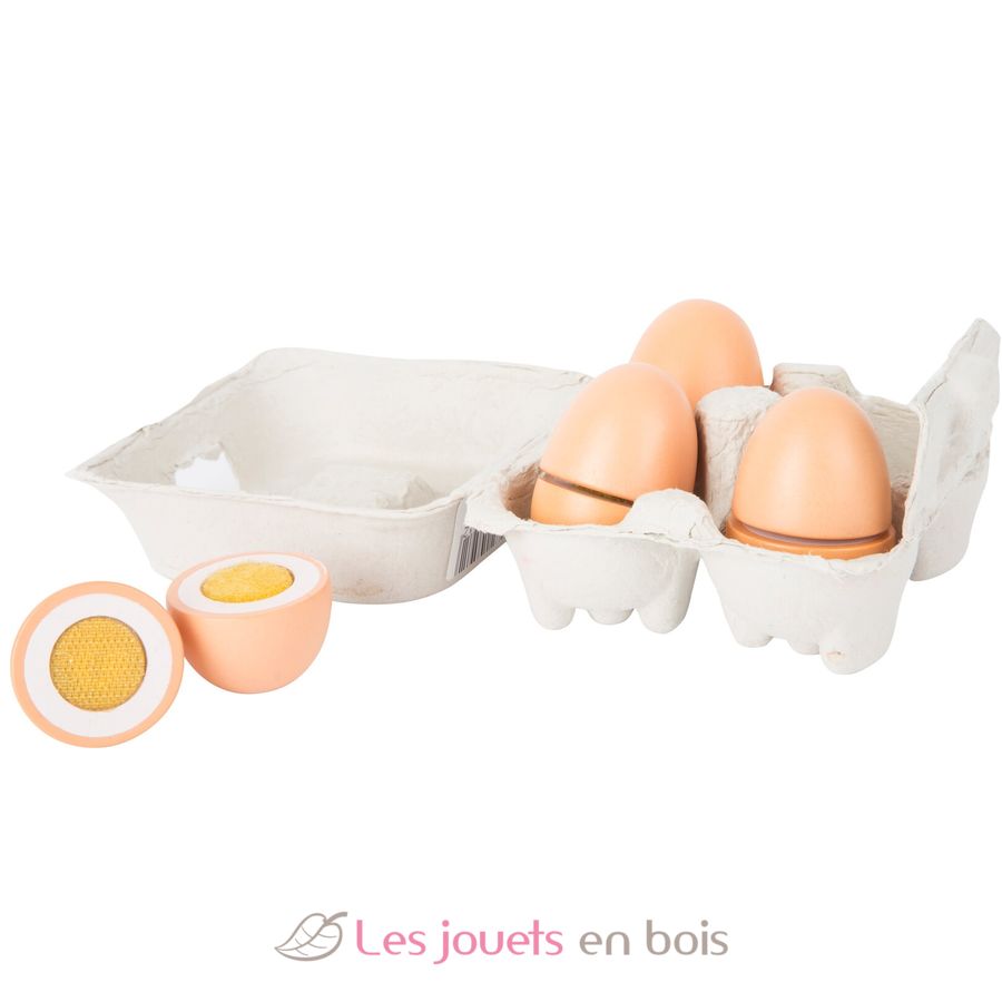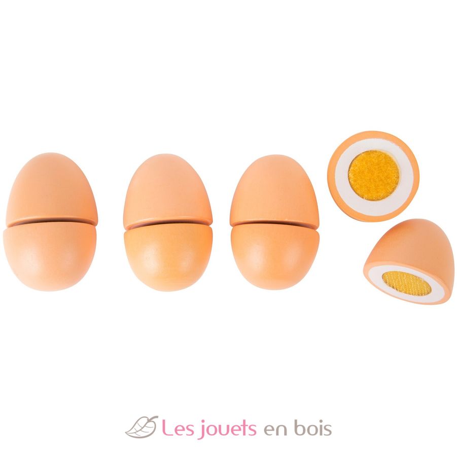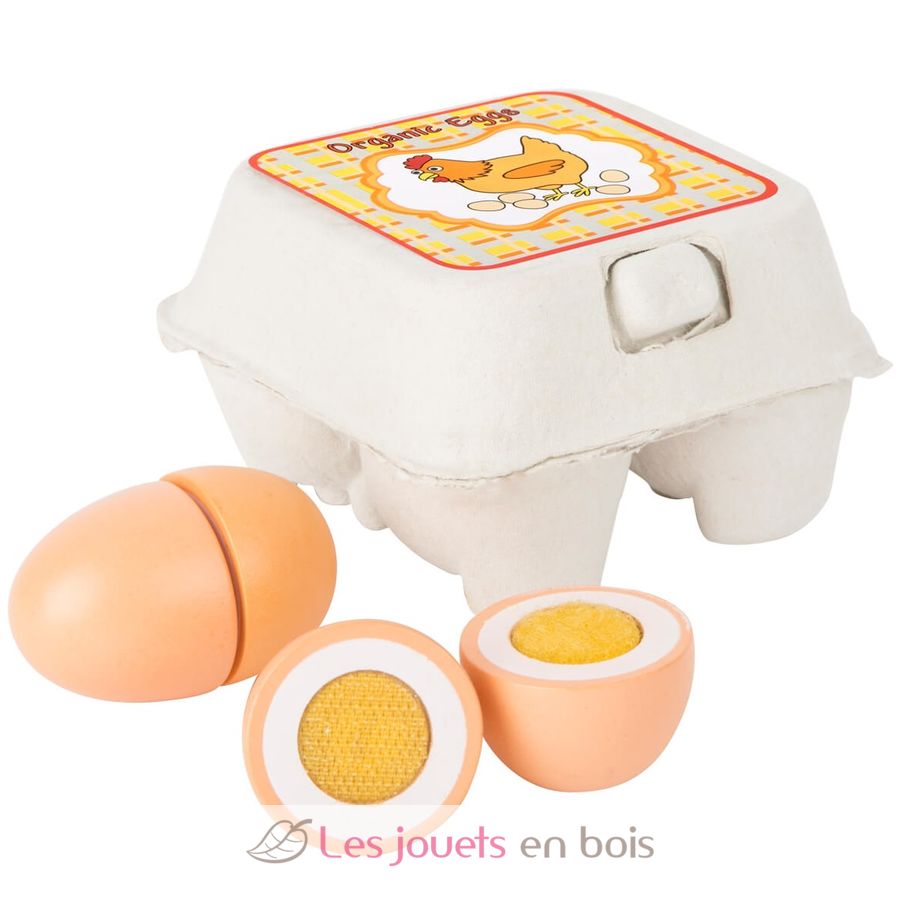 Ces quatre œufs en bois solide ont une haute valeur ludique. Ils sont maintenus par du velcro, ce qui permet aux enfants de s'amuser à les découper pour les cuisiner, avant de les reconstituer. La boîte à oeufs en carton protège les œufs pendant le transport.