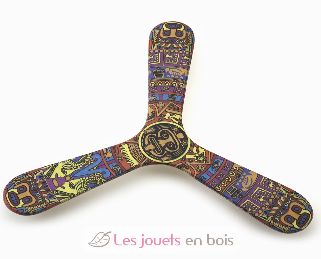 Le boomerang tripale est idéal pour débuter car très planant et facile à rattraper. Avec son vol très circulaire, il est parfait pour l’échauffement et pour ceux qui n’ont pas beaucoup d’espace. Il conviendra parfaitement aux plus jeunes grâce à son poids et sa petite taille qui faciliteront la rotation de l’engin. Il est conçu pour lanceurs droitiers. Il est fabriqué dans le meilleur contreplaqué aviation, qui est léger et résistant. Il est imprimé avec des motifs du peuple Maya. Sa forme et son envergure de 24 cm permettent à ce boomerang de voler à une distance d'environ 20 mètres.