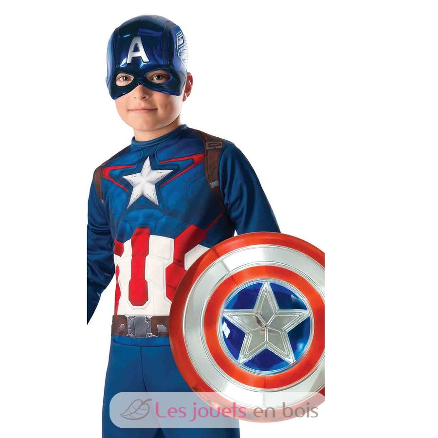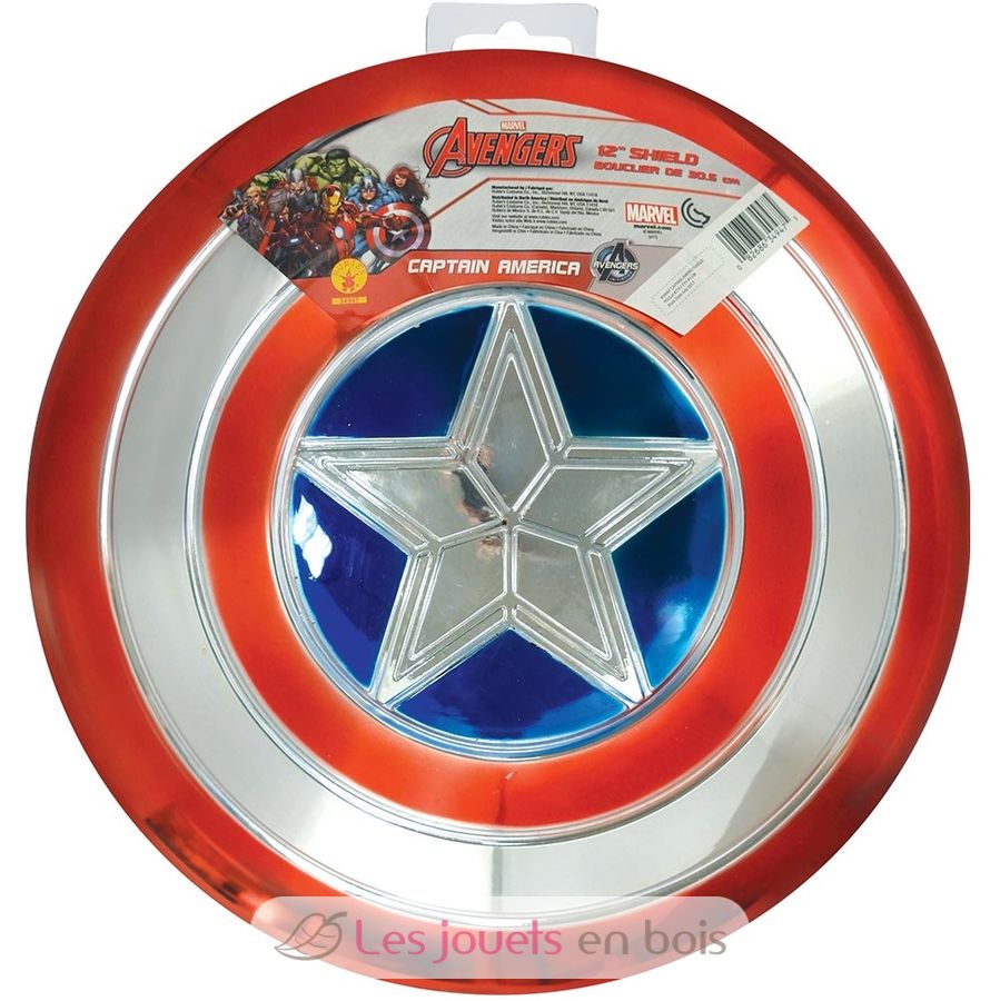 Ce bouclier pour enfant est fabriqué en plastique rouge, bleu et argenté. Il mesure 30,5 cm de diamètre et dispose de lanières élastiques à l’arrière pour fixation sur l’avant-bras et le poignet. C'est l'accessoire idéal pour compléter le déguisement de Captain America (combinaisons et masque non inclus).