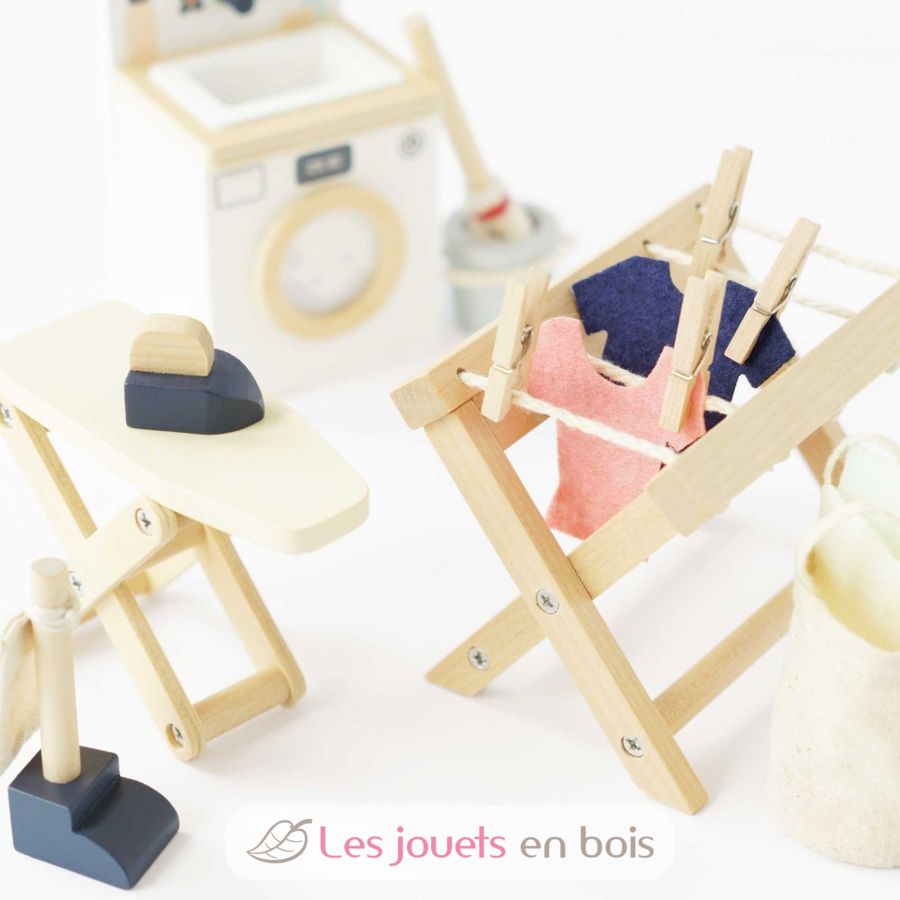 Cet ensemble de buanderie de 16 pièces en bois certifié FSC comprend un lave-linge avec évier, un étendoir à linge pliant, un fer à repasser et une planche à repasser pliante, 4 porte-manteaux miniatures, des vêtements en feutre, un panier à linge, un aspirateur, un balai et un seau. Dimensions du lave-linge avec évier : 6,2 x 5,6 x 9,6 cm.