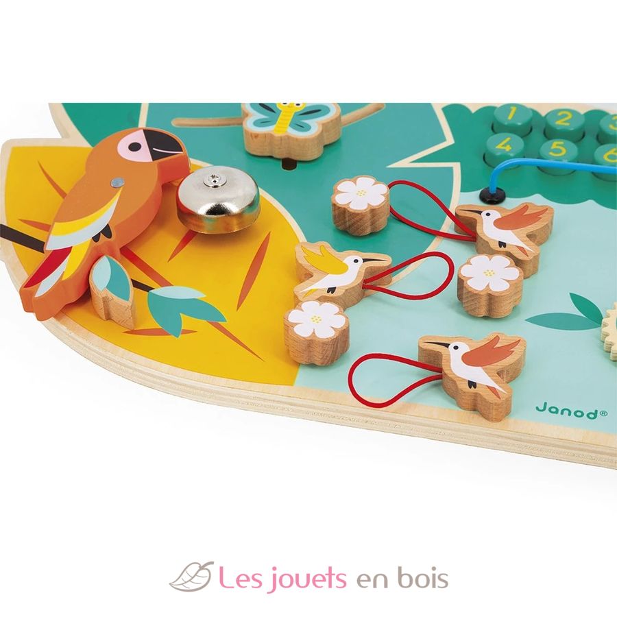 Que de plaisirs tactiles et sonores au service de la motricité fine de bébé. Et des ouvertures diverses et accessibles, pratiques pour s’entrainer à s’habiller. C’est un jouet d’éveil polyvalent, complet et parfait pour des moments de jeu autonomes. Vous pouvez facilement fixer ce panneau d'activité en bois au mur. Il saura trouver sa place dans une chambre d’enfant, grâce à son style tropical et ses couleurs vives.