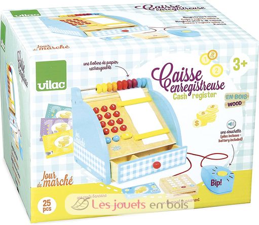 La caisse enregistreuse en bois de la marque Vilac est l'accessoire indispensable pour tout bon marchand ! Cette caisse enregistreuse dispose d'un tiroir caisse et d'une douchette sonore pour scanner les articles, mais aussi de pièces, de billets et d'une carte de crédit pour jouer à la marchande pendant des heures.