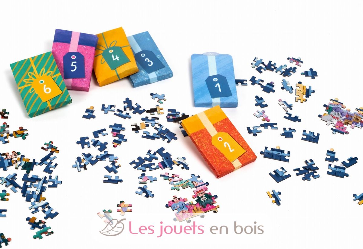 Derrière chacune des 24 fenêtres d’appartement se cache un puzzle de 50 pièces en carton. Assemblez-les chaque jour, puis positionnez-les pour recréer la scène festive complète.