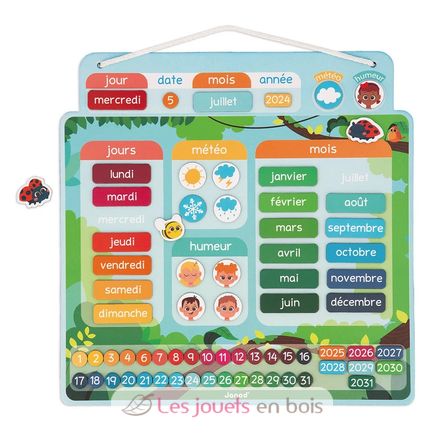 Calendrier magnétique en français, un semainier en bois à suspendre de 36 cm de côtés. A partir de 3 ans.