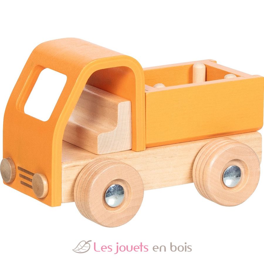 Camion benne orange, un véhicule en bois miniature de la marque Goki.