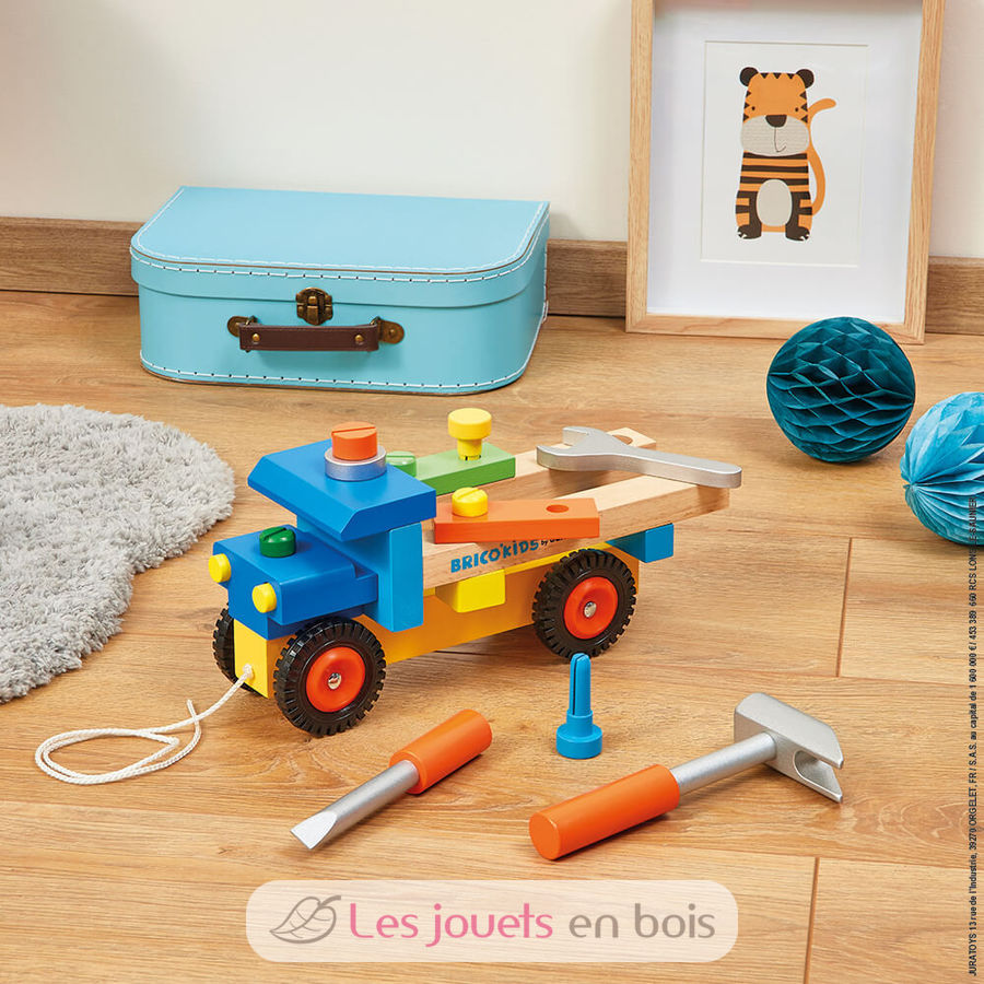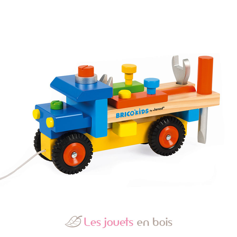 Joli camion et ses outils en bois. Un camion aux couleurs vives, à démonter et remonter pour que vos enfants jouent les petits bricoleurs. A la fois un jeu de construction avec des écrous, des plaques et des vis qu’il faut assembler pour reconstituer un magnifique camion et un jouet à promener pour développer la motricité de l’enfant. Livré avec 17 pièces dont 3 outils.