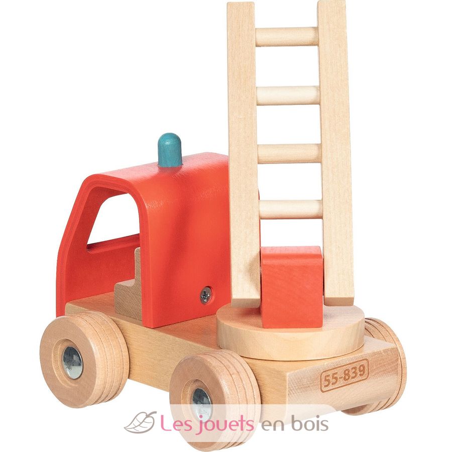 Camion de pompiers avec échelle rouge, un véhicule en bois miniature de la marque Goki.