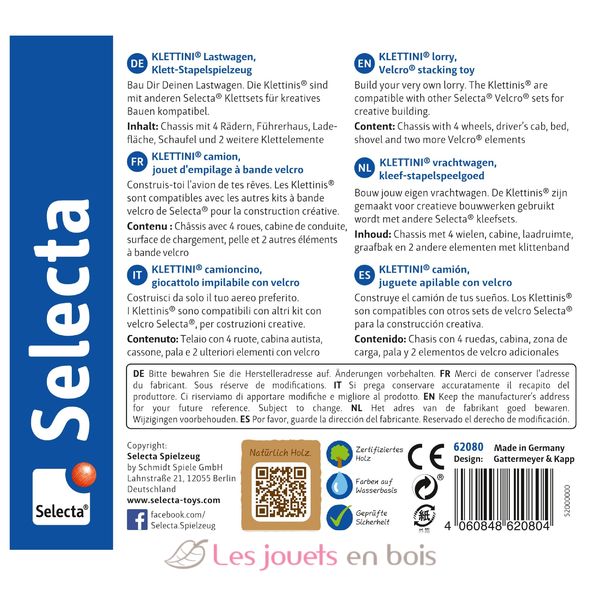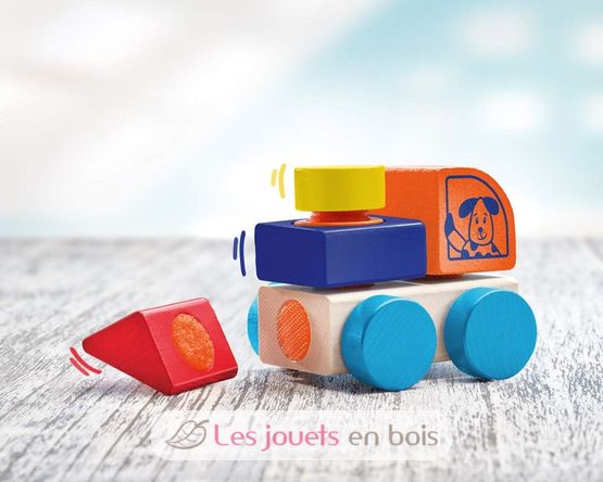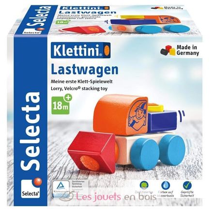 Ce véhicule en bois fait partie de la collection des Klettinis de chez Selecta, des jouets conçus pour les petites mains et compatibles entre-eux.