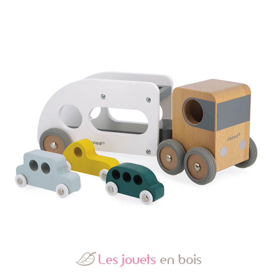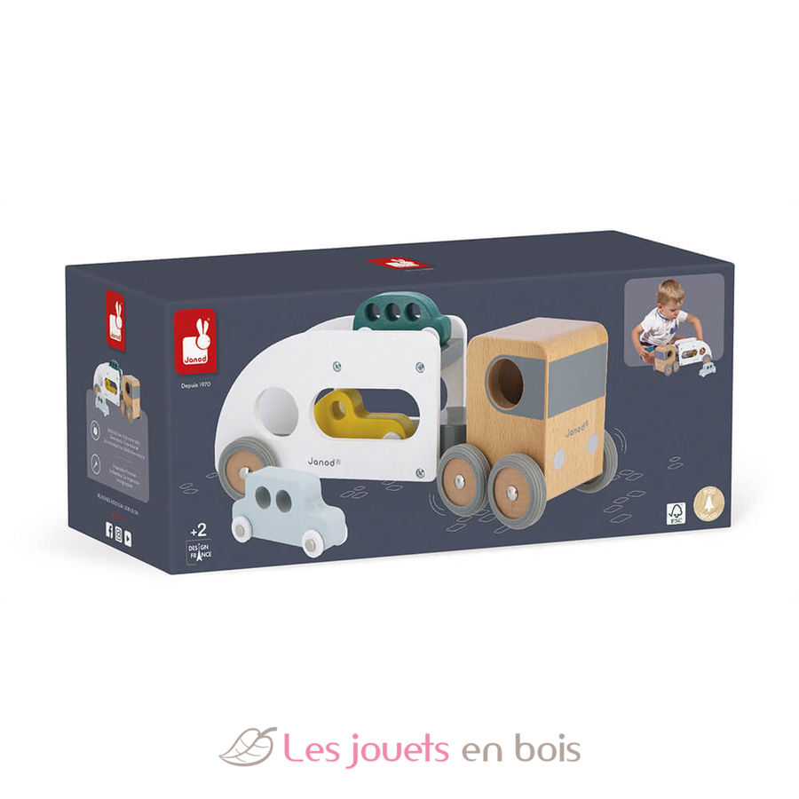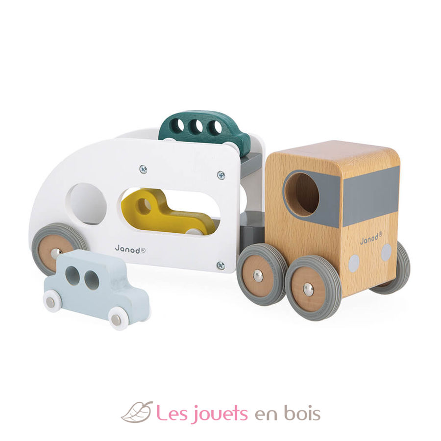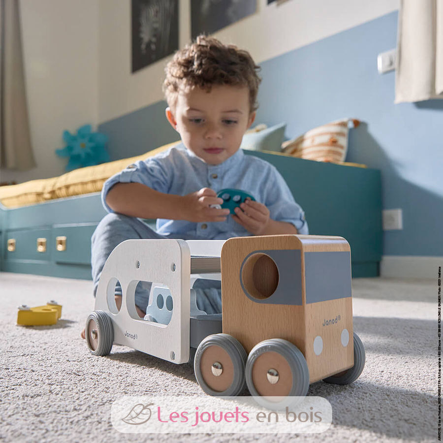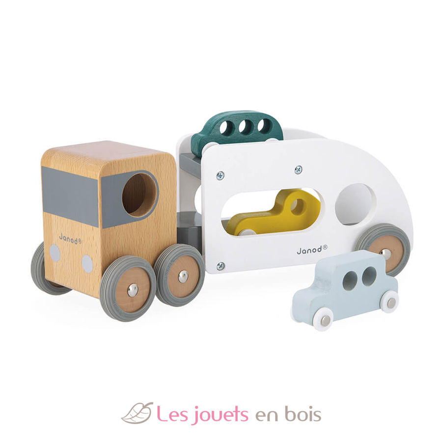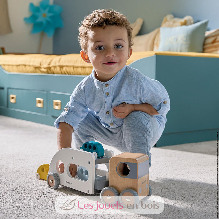 Camion porte-auto avec 3 véhicules, un camion transporteur de voitures en bois de la marque Janod. Référence J04637.