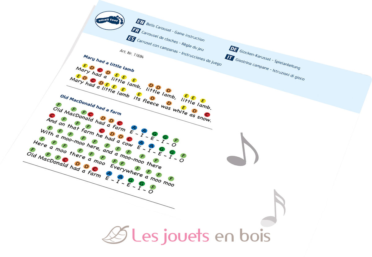 Ce carrousel de cloches est accompagné de 8 partitions permettant aux petits musiciens de jouer 8 mélodies différentes. Le code de couleurs permet de guider les débutants et jeunes enfants dès 3 ans.