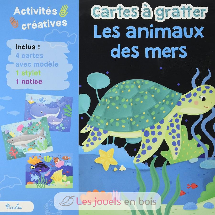 Ce kit de loisirs créatifs pour enfant contient 4 cartes à gratter avec modèle, 1 stylet et 1 notice. L'ensemble est très coloré avec des illustrations d'animaux des océans !