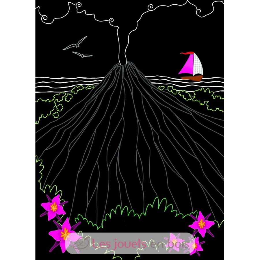 Ce kit de loisirs créatifs pour enfant contient 4 cartes à gratter avec modèle, 1 stylet et 1 notice. L'ensemble est très coloré avec des illustrations volcaniques !