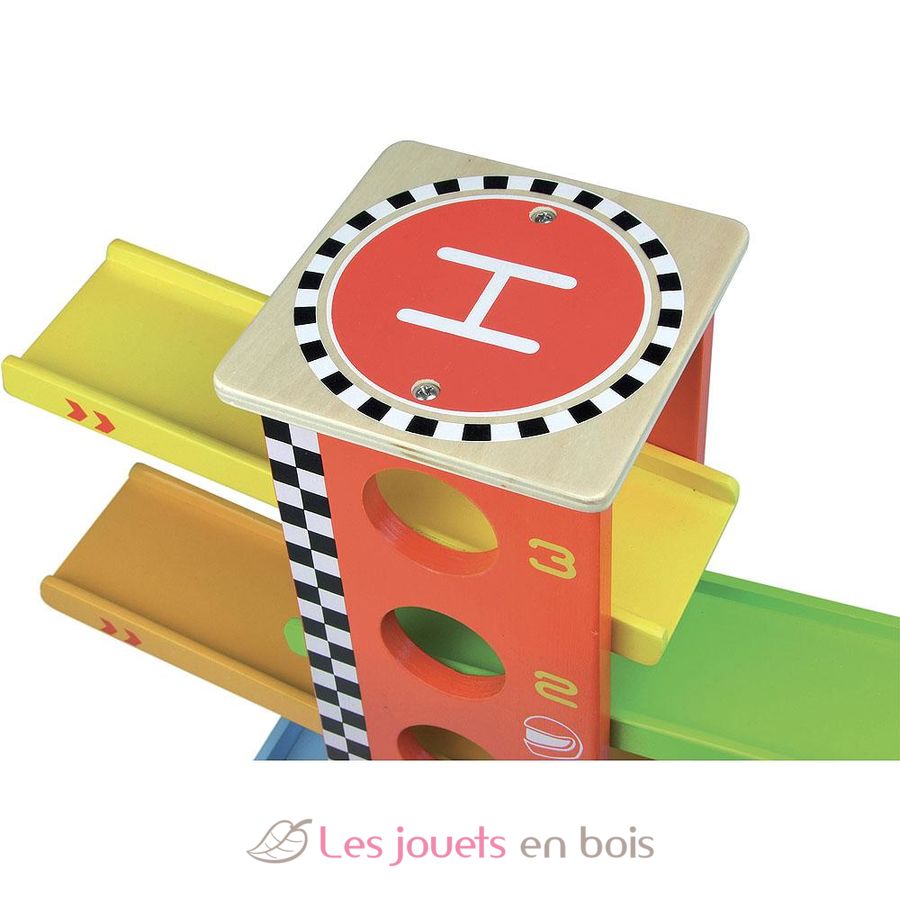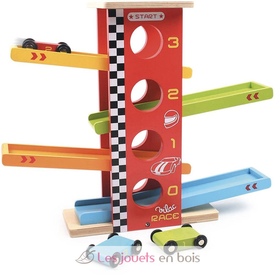 Cascade de voitures racing en bois de la marque Vilac. Les voitures dévalent les rampes les unes après les autres... Toujours plus vite ! Livrée avec 3 voitures en bois de couleurs différentes.