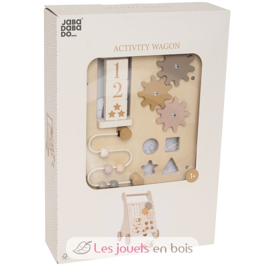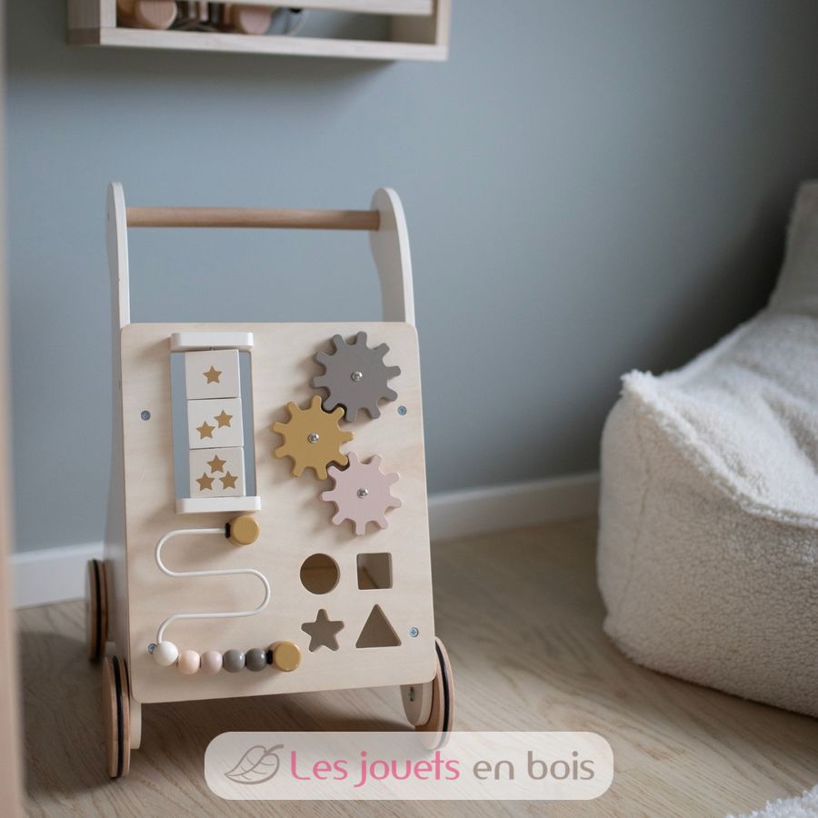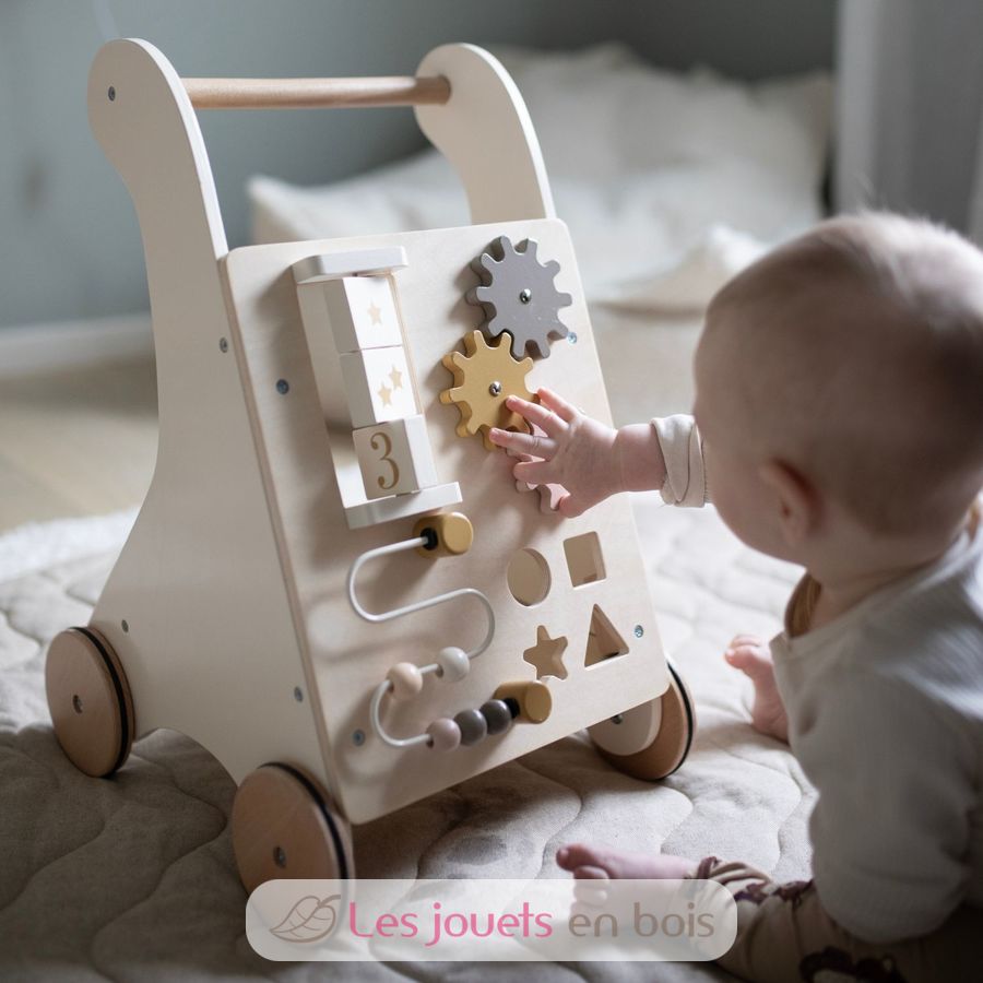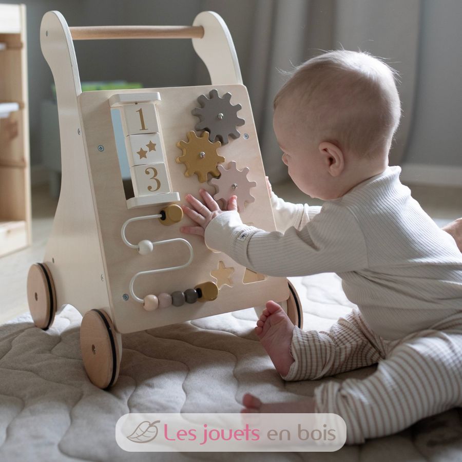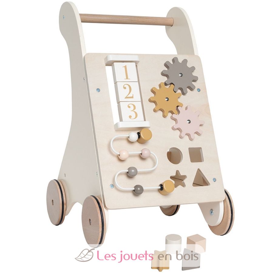 Votre enfant pourra tester sa dextérité grâce aux activités ludiques proposées et passera de longs moments à découvrir les engrenages ou encore le boulier. Ce trotteur est doté de roues en bois massif avec des bords en caoutchouc pour rouler tout en douceur. Un compartiement situé au dos du chariot permet à l'enfant d'y ranger ses jouets préférés.
