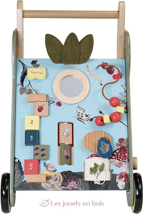 Ce joli chariot d'activités en bois offre trois façons de jouer : assis, debout ou en mouvement.