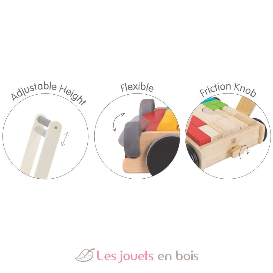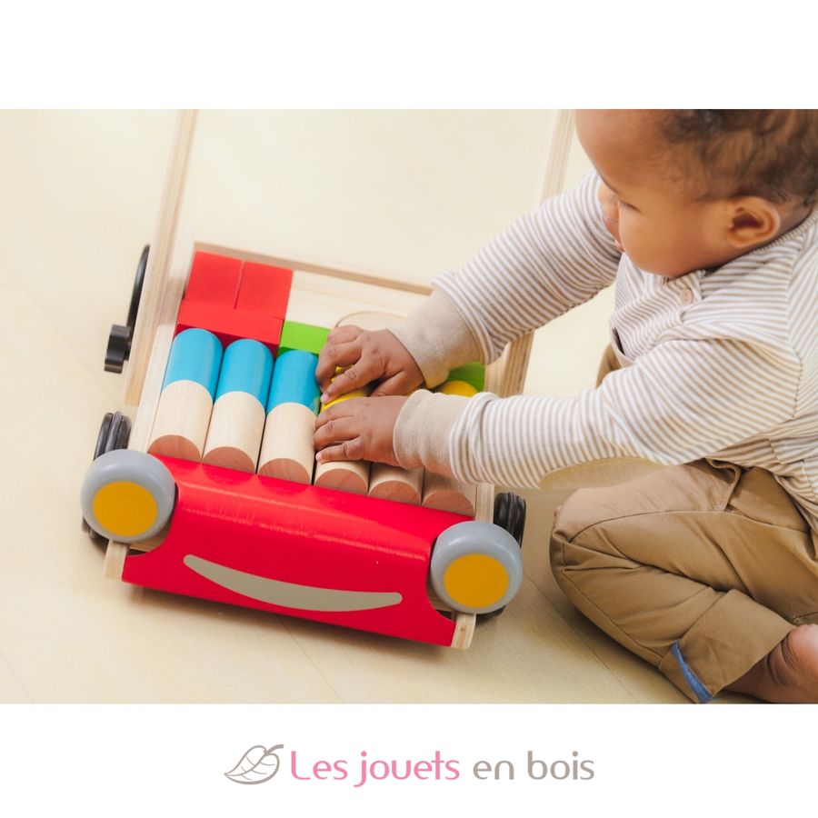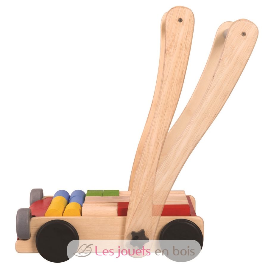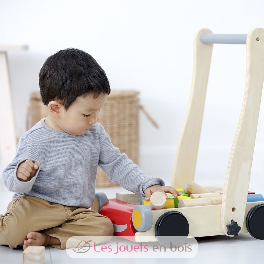 Un chariot de marche avec cubes en bois de la marque PLAN TOYS. Réf. PT5123.