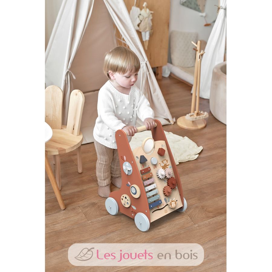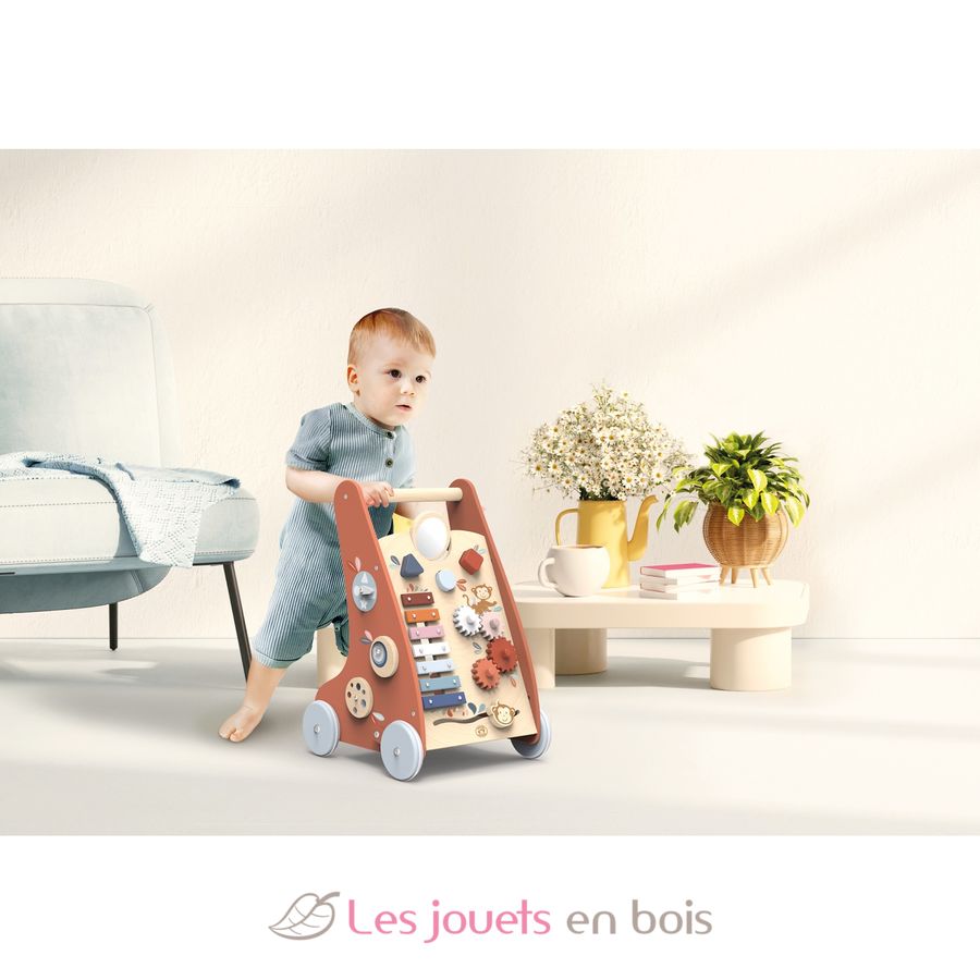 Ce trotteur multi-activités en bois, équipé d'un système de freinage, permet à votre enfant de gagner en confiance et de développer son équilibre lors de ses premiers pas.