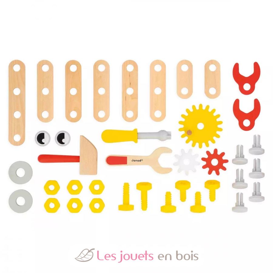 Ce jouet d'éveil est plein de surprises : 3 outils magnétiques sur le devant, un étau sur le côté, et même un espace de rangement en son centre ! Aussi pratique pour bricoler qu'à faire rouler. 38 accessoires de bricolages complètent ce chariot magnétique pour bébé : 18 accessoires en bois (plaquettes et engrenages), 20 accessoires en plastique (vis, écrous, clous). Le petit plus : les vis sont équipées de crans pour toujours plus de réalisme.