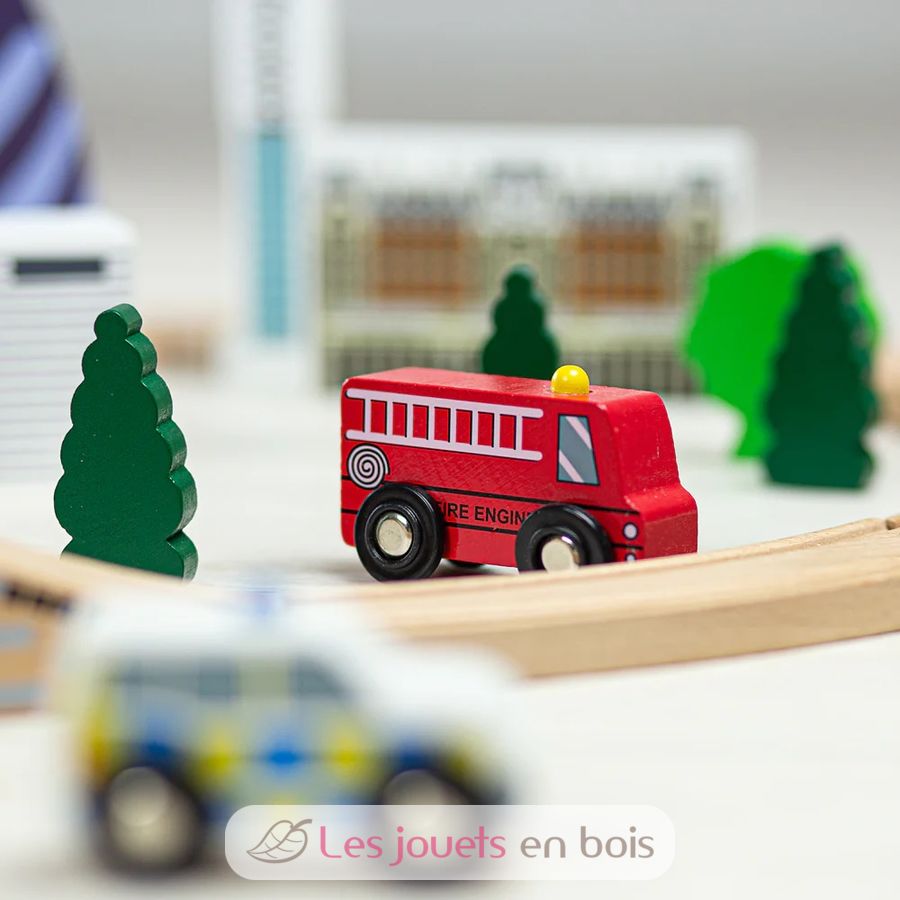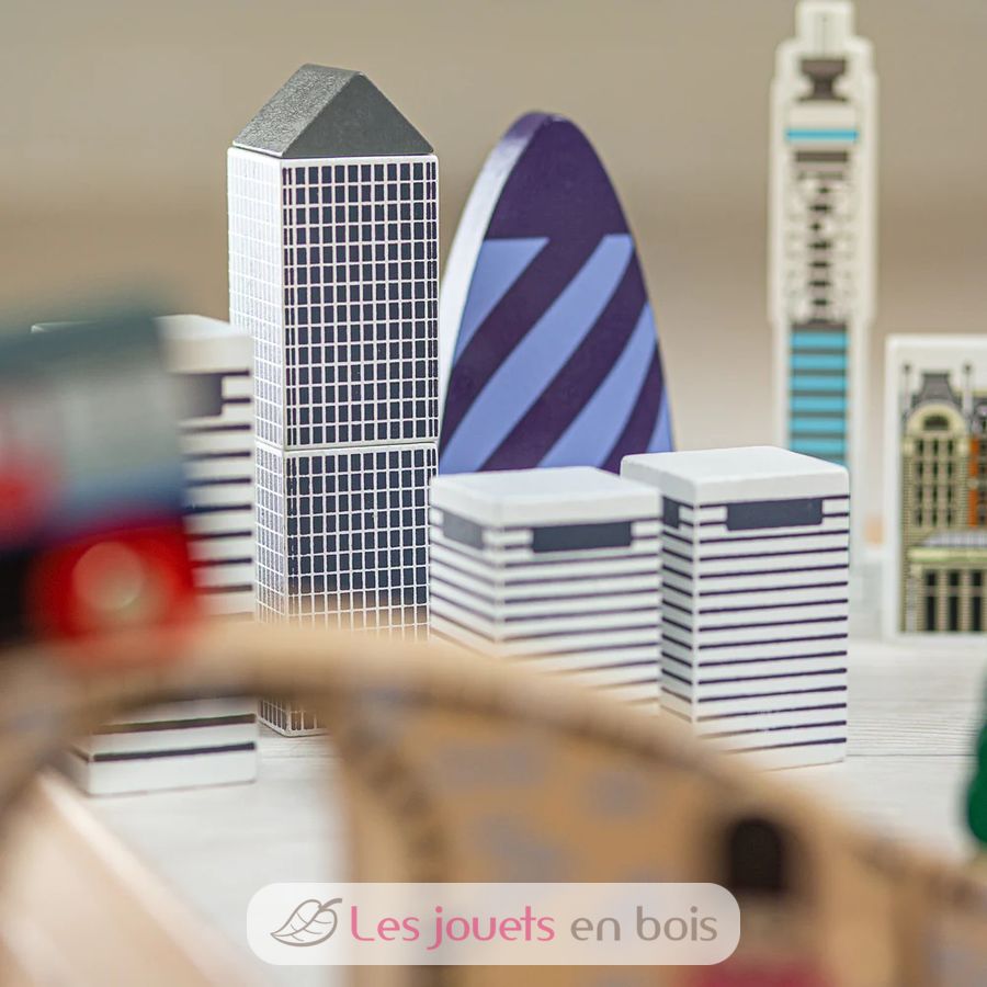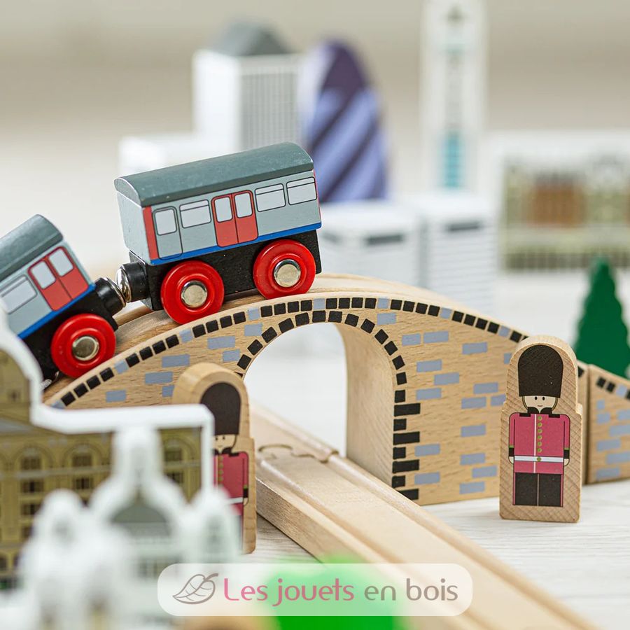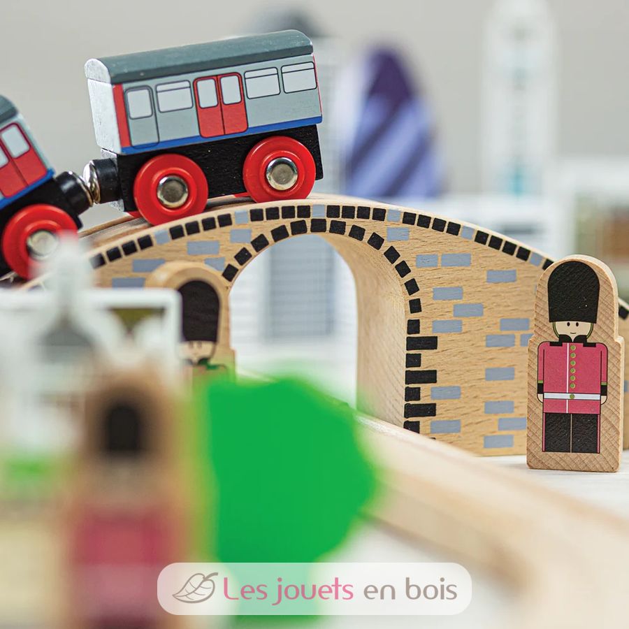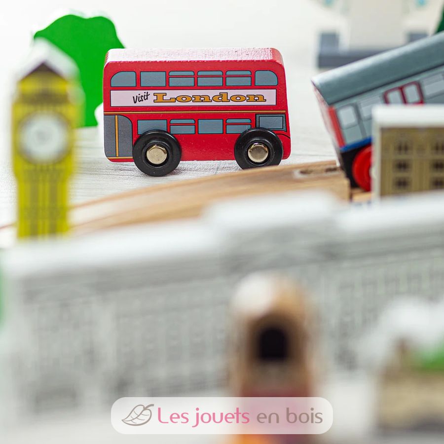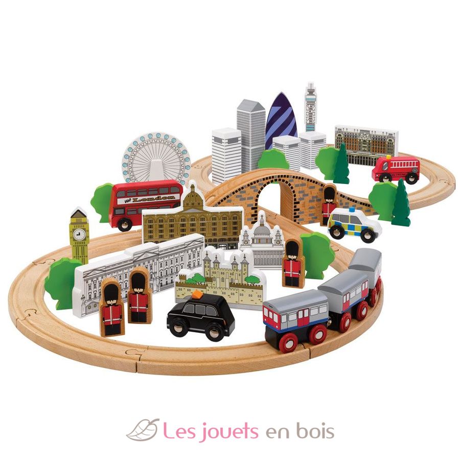 Avec plus de 50 pièces, cet ensemble comprend 17 pièces de rails en bois, un train composé de 3 wagons, des arbres et des bâtiments emblématiques de la ville de Londres. Il y a aussi ces véhicules connus comme le taxi noir londonien et le bus rouge à deux étages.