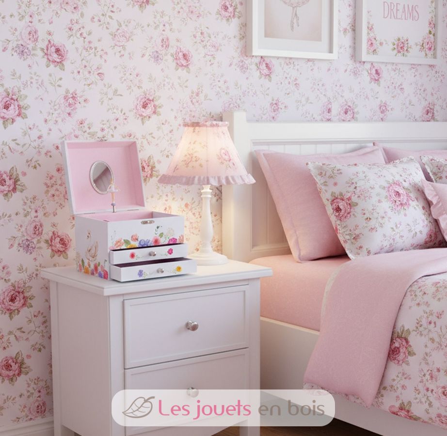 Cette jolie boite à musique comprend deux tiroirs et un baguier pour ranger les précieux précieux de votre enfant. Elle est dotée d'un miroir ovale pour une touche de féérie.
