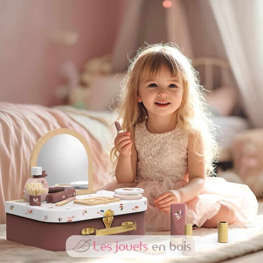 La valise s'ouvre pour révéler une collection colorée de 12 accessoires de beauté en bois certifié FSC, parfaits pour imiter les routines beauté des grands de manière ludique, sûre et sans écran. Du maquillage factice aux outils de coiffure, chaque pièce est soigneusement conçue pour les petites mains, favorisant ainsi le développement de la motricité fine, l'imagination et les interactions sociales.