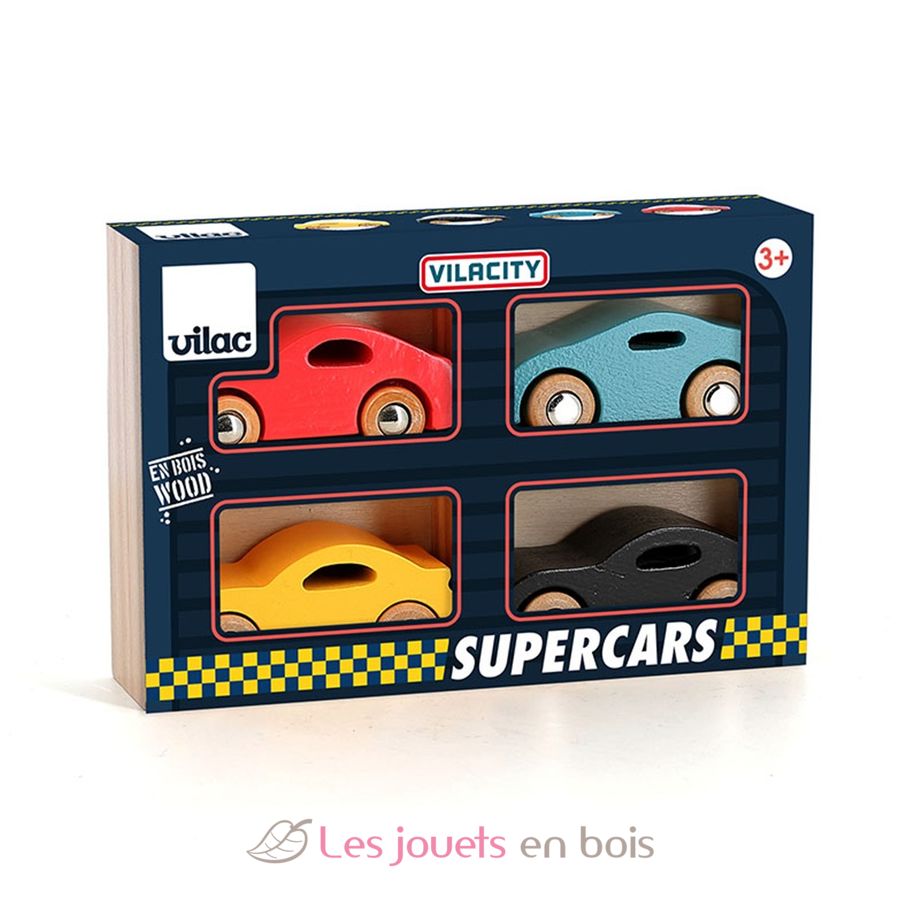 Coffret de 4 voitures en bois Super cars, des véhicules miniatures en bois de la marque Vilac. Référence 2369.