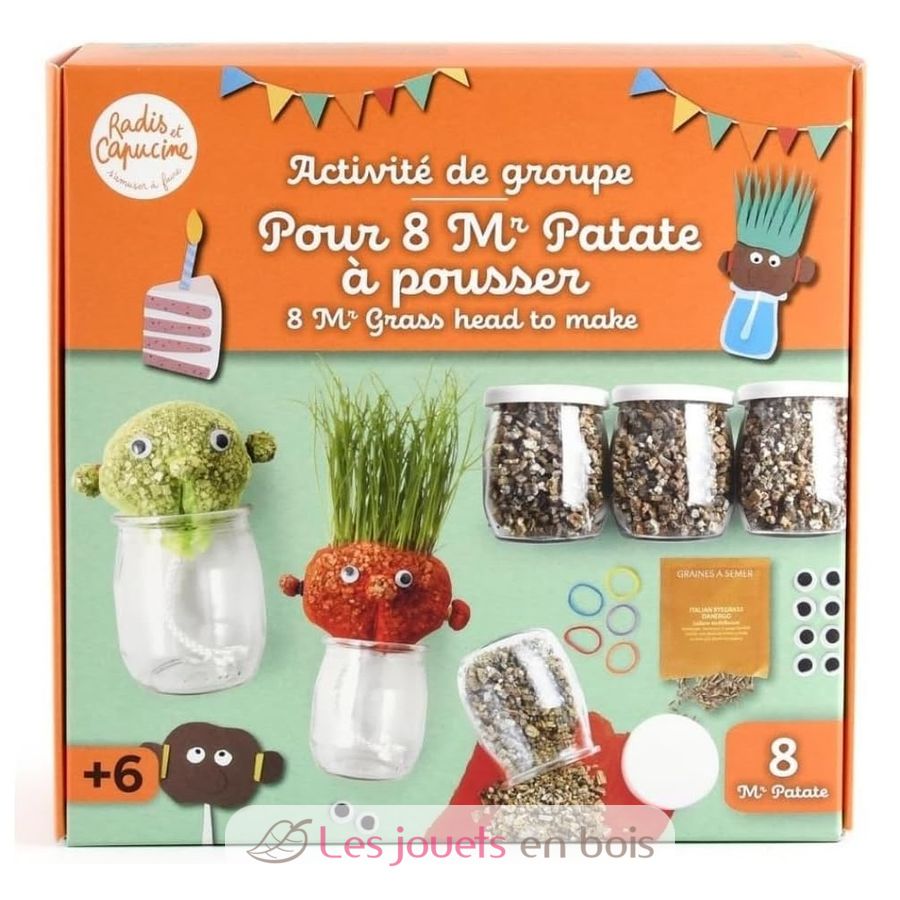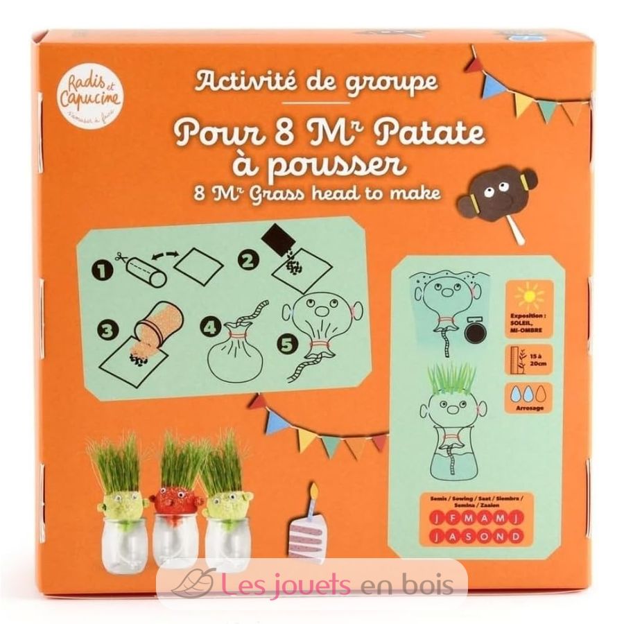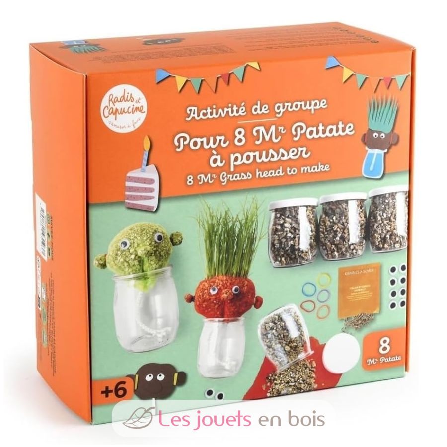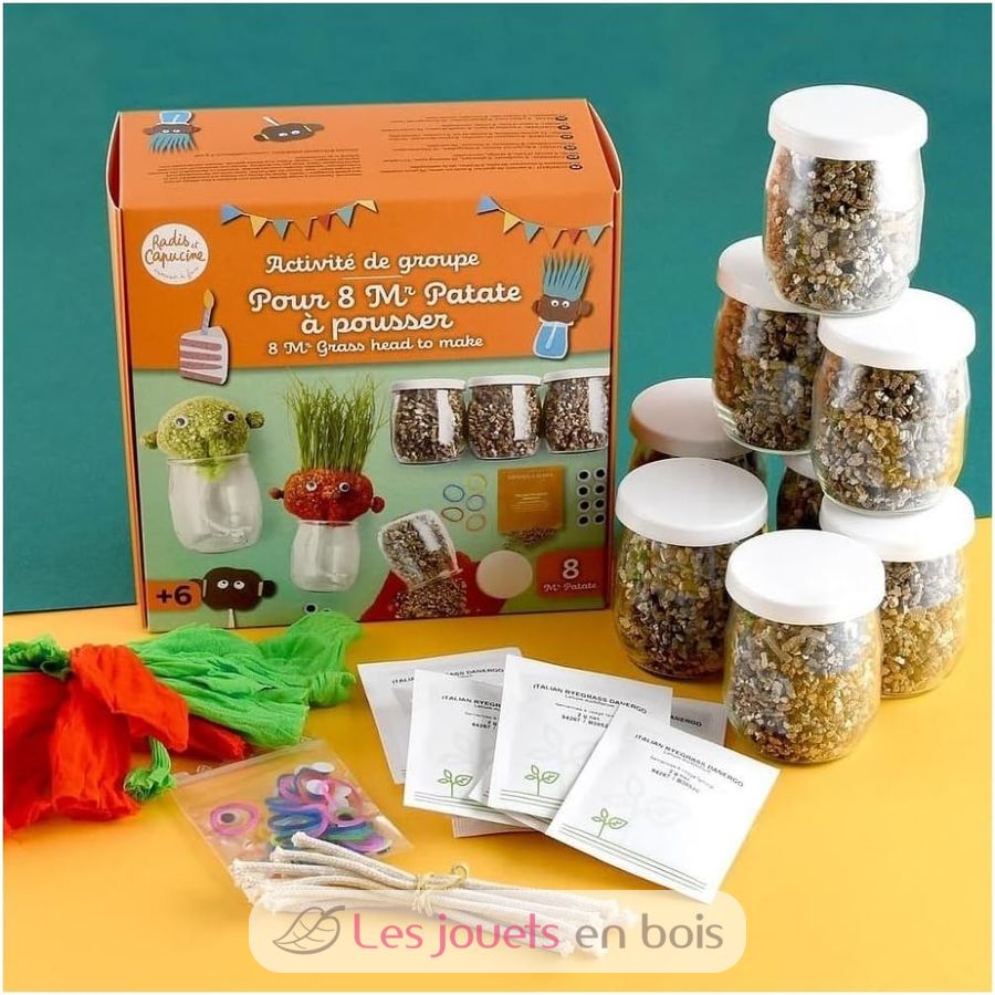 Ce coffret d'activités manuelles est idéal pour animer un atelier ludique et créatif, en classe ou à un goûter d'anniversaire avec les copains (pour 8 enfants). Chaque enfant pourra créer son propre Mr Patate et repartir avec à la maison pour voir ses cheveux pousser jour après jour.
