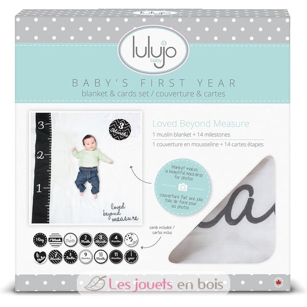 Ce coffret "ma première année" est constitué d’une couverture lange en mousseline de coton et de 14 cartes présentant l’âge de l’enfant de 1 jour à 1 an. Les cartes sont en anglais (1 day, 1 week, 1 month etc…).