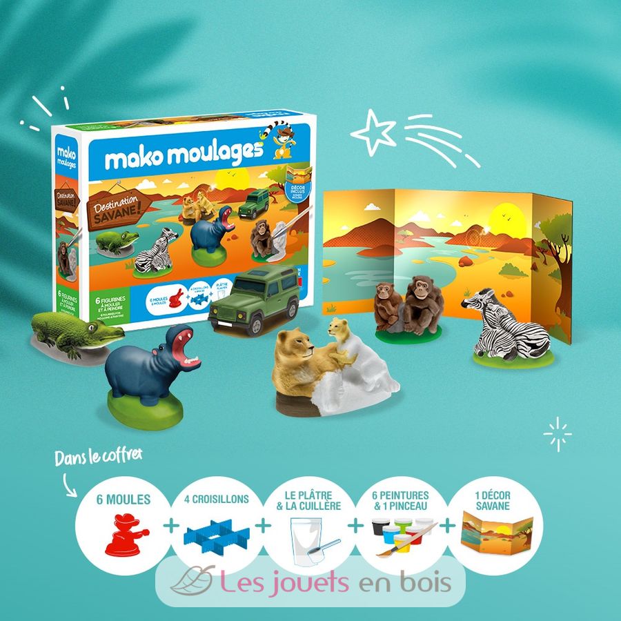 Coffret mako moulages Destination Savane avec 6 figurines à mouler et à décorer. Fabriqué en France.