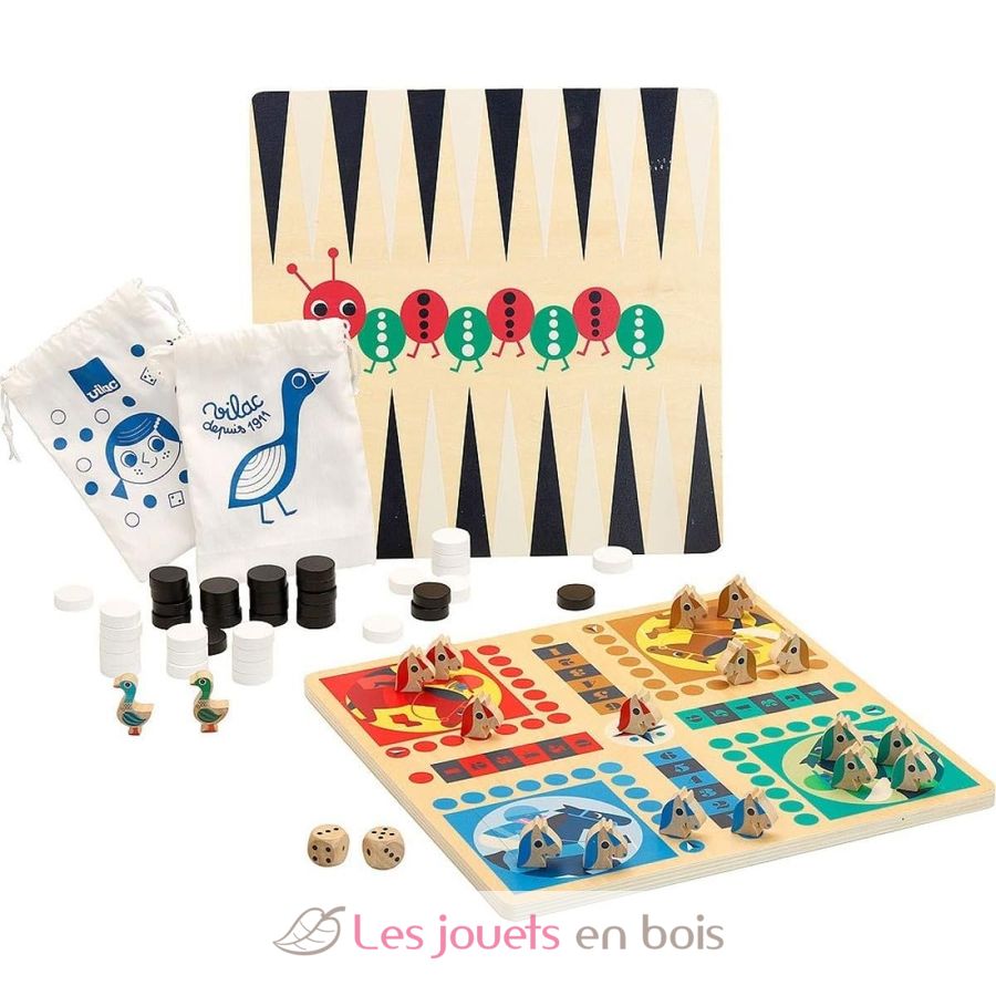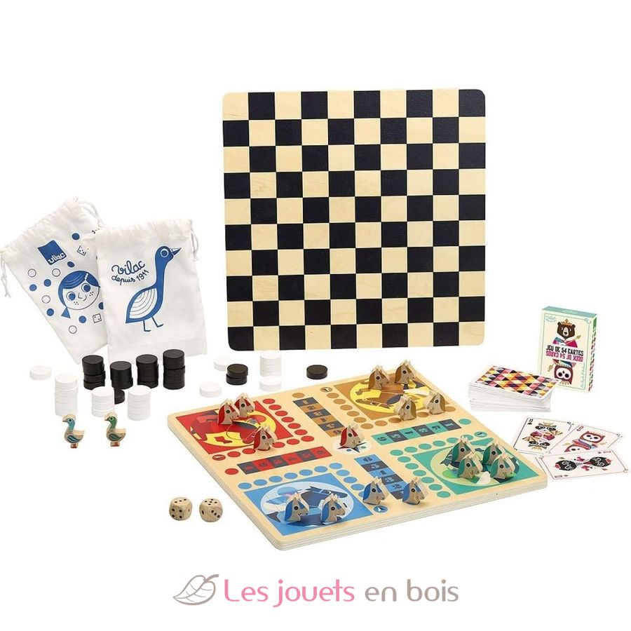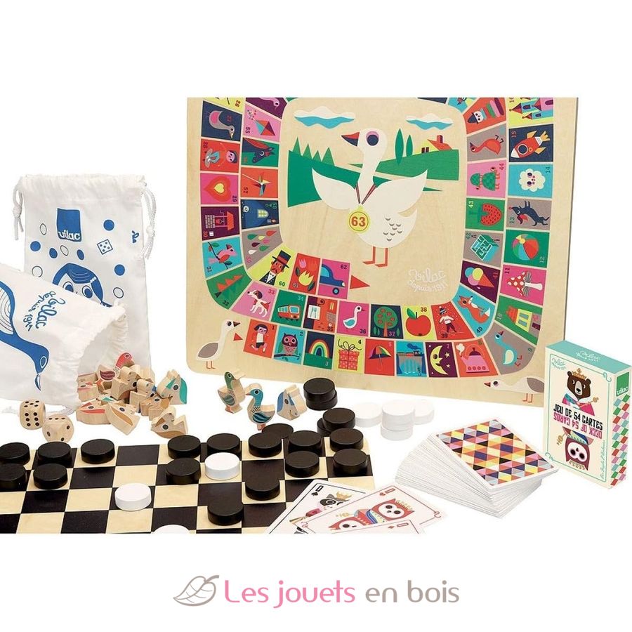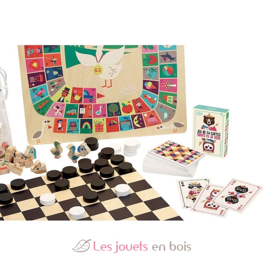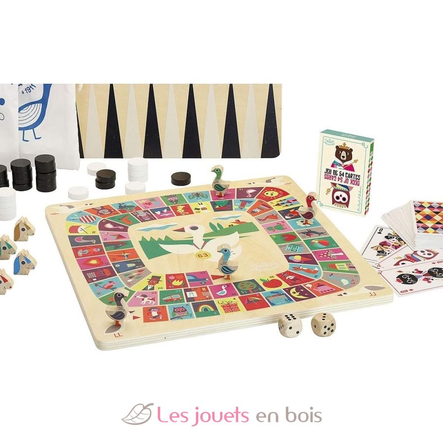 Ce coffret se compose de 2 plateaux de jeu en bois décorés recto-verso, d'un jeu de 54 cartes et d'un livret de règles du jeu. Vous pourrez jouer au backgammon, jeu de l'oie, jeu des petits chevaux, jeu de dames et aux cartes. À partir de 4 ans.